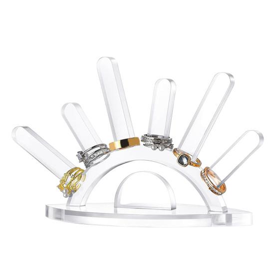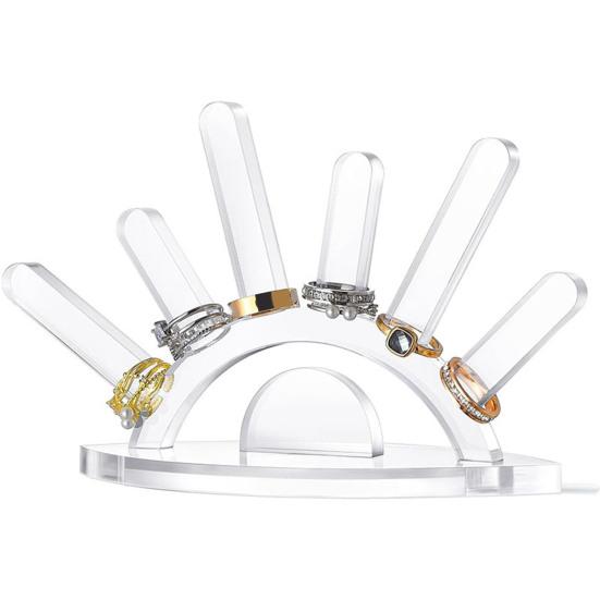 Благодаря шести стойкам для колец этот держатель вмещает большое количество колец, обеспечивая легкий доступ и эффективную организацию на комодах, тумбочках или столешницах.