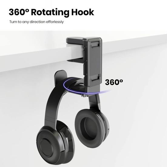 Инновационная функция вращения и поворота подставки на 360 градусов обеспечивает легкий доступ к наушникам, оптимизируя использование пространства на столе.. Его конструкция 3-в-1 включает в себя поворотный крючок и две съемные подставки, на которых одновременно можно разместить два геймпада и гарнитуру.