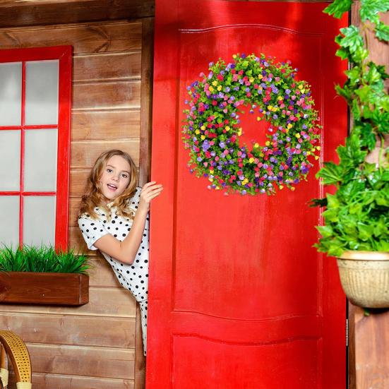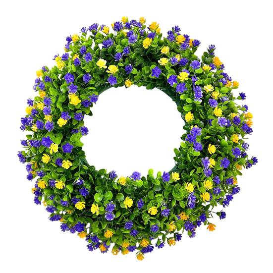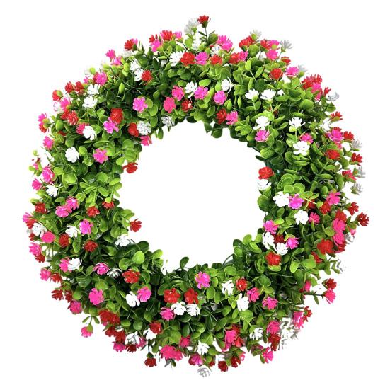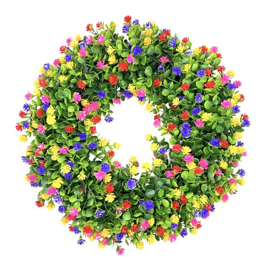 Яркое цветочное разнообразие: Украшенный множеством красочных цветов, включая красные, желтые, розовые и фиолетовые оттенки, дополненных зелеными листьями, этот венок излучает живую и яркую эстетику, которая мгновенно оживляет любую обстановку.