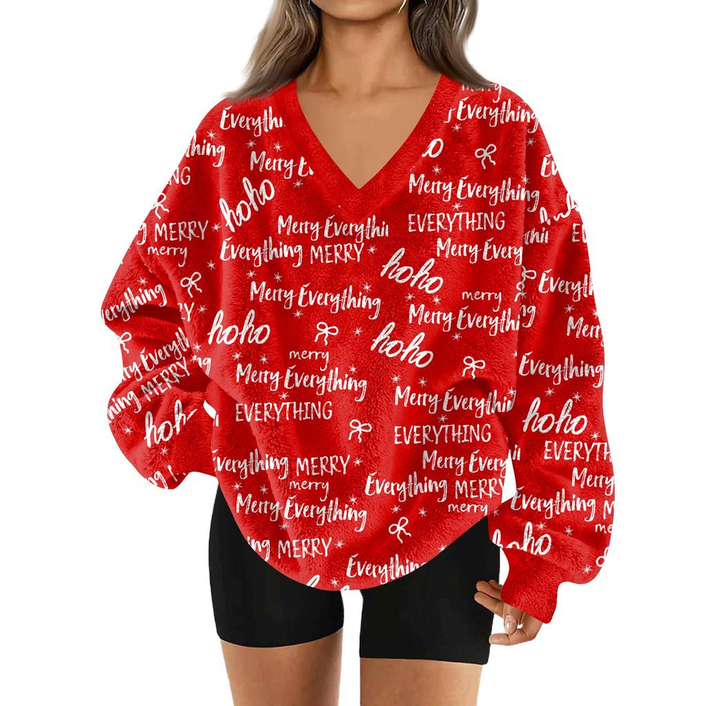Женский модный пуловер с V-образным вырезом, рождественским принтом, длинным рукавом, повседневный, плюшевый, теплый, с карманом, толстовка, топ