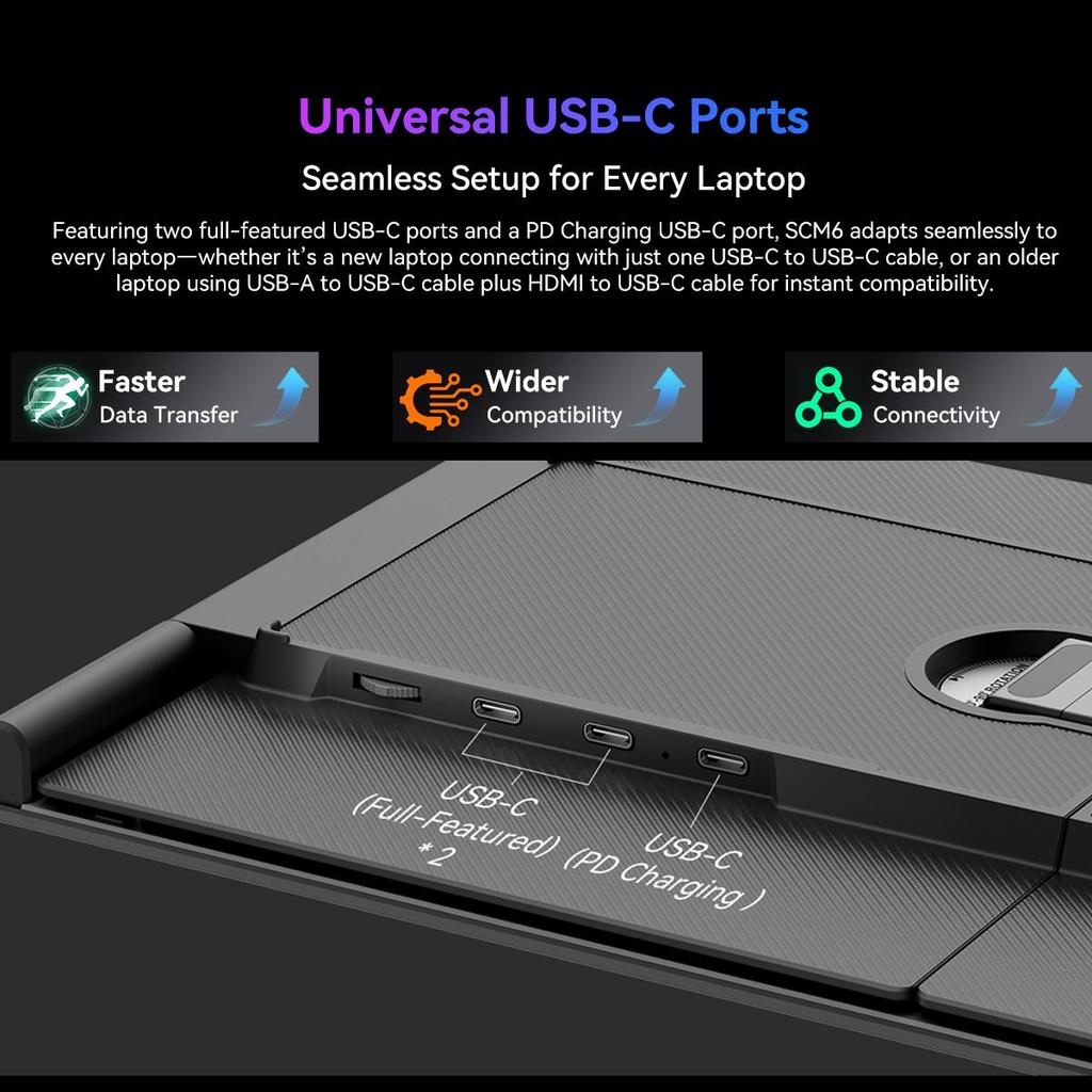 SCM6 — это высокопроизводительный портативный монитор, сочетающий в себе элегантный, прочный дизайн и исключительную универсальность.. Изготовлен из премиального сплава алюминия, имеет компактный и легкий форм-фактор, размеры всего 332 × 207 × 15,6 мм и вес 600 г для максимальной портативности.. В его основе — яркий 14-дюймовый IPS-дисплей с разрешением 1080p FHD, обеспечивающий четкое изображение с яркостью 300 нит.. SCM6 выделяется своей передовой конфигурацией с тремя портами USB-C, поддерживающими высокоскоростную передачу данных, вывод видео и надежную зарядку PD мощностью 100 Вт.. Благодаря широкой совместимости с системами Mac, Windows, Android, Linux и Chrome, он служит идеальным дополнительным экраном plug-and-play для профессионалов, геймеров и удаленных работников в движении.