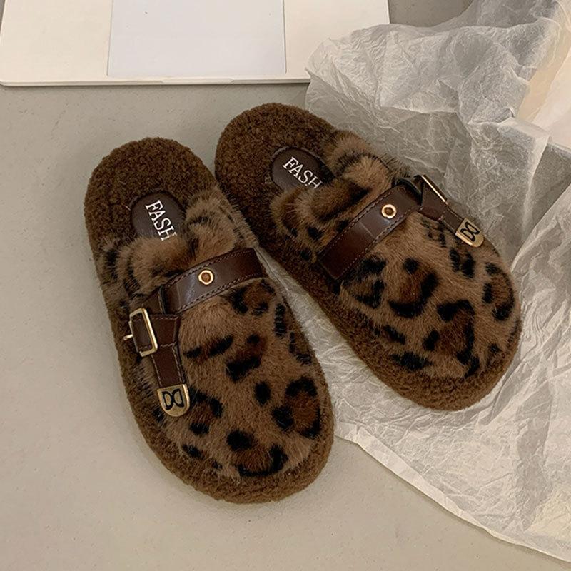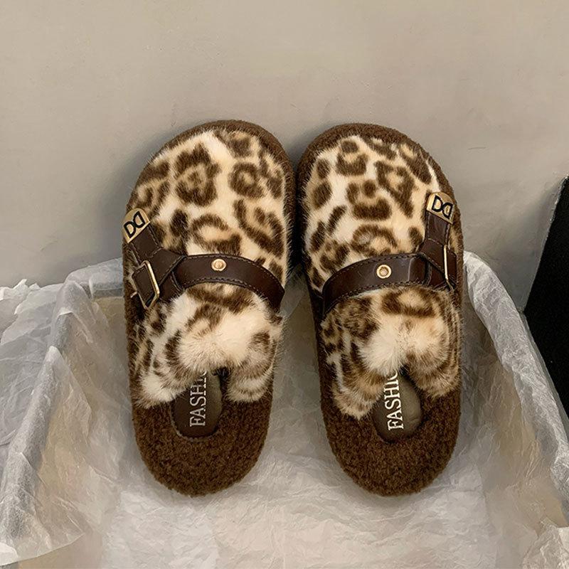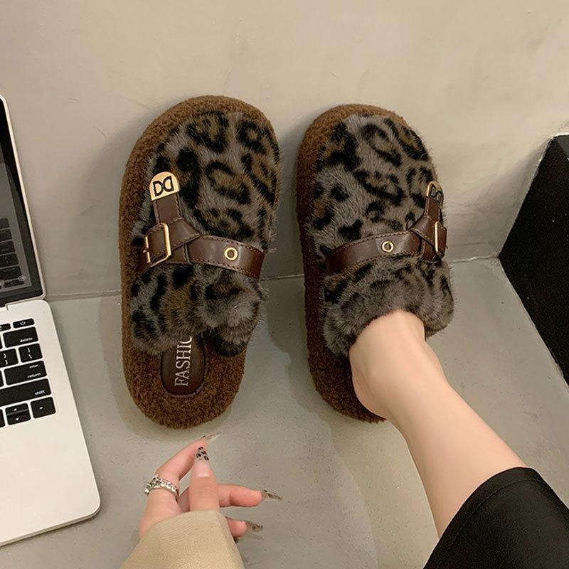 Взрыв популярности интернет-знаменитости леопардовый принт пушистые тапочки женские осенне-зимние новые толстоподошвенные плюшевые с закрытым носком полусапожки хлопковые туфли