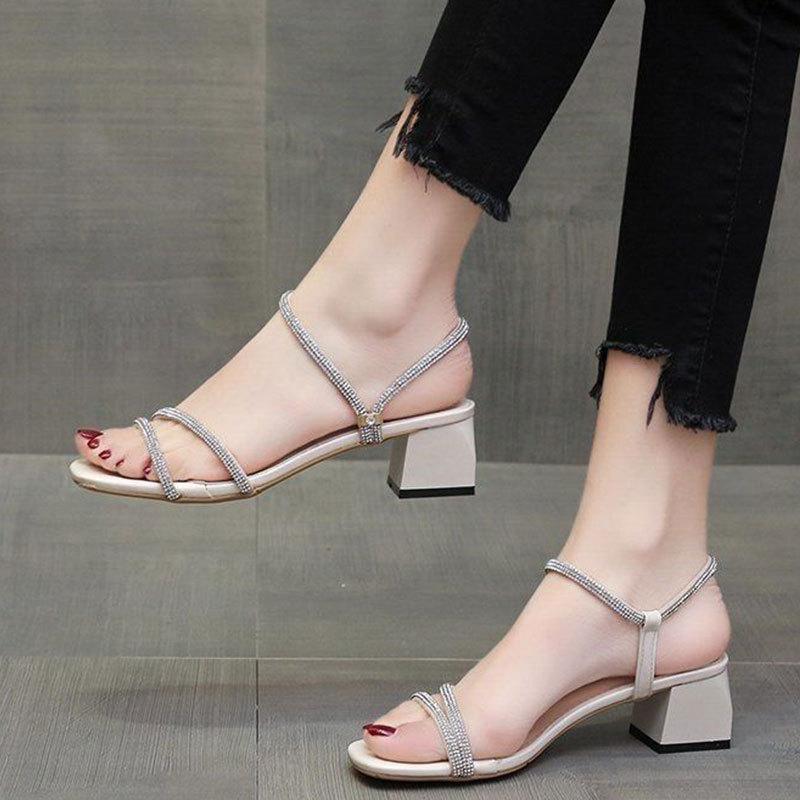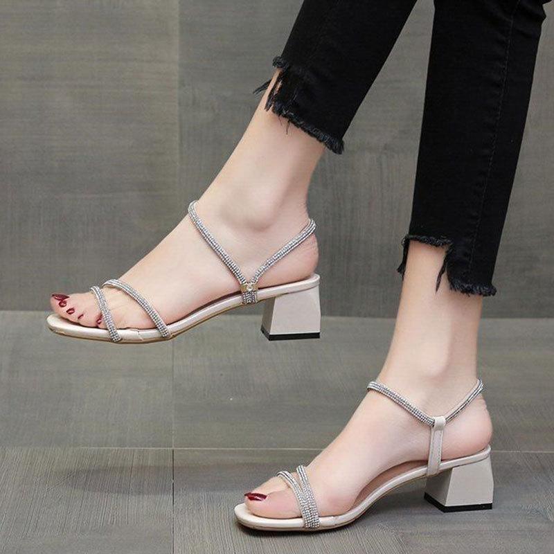 2025 Новые Универсальные Легкие Сандалии Средний Каблук Интернет-знаменитости ins Тренд Стразы Толстый Каблук Ремешок Римские Сандалии на Высоком Каблуке