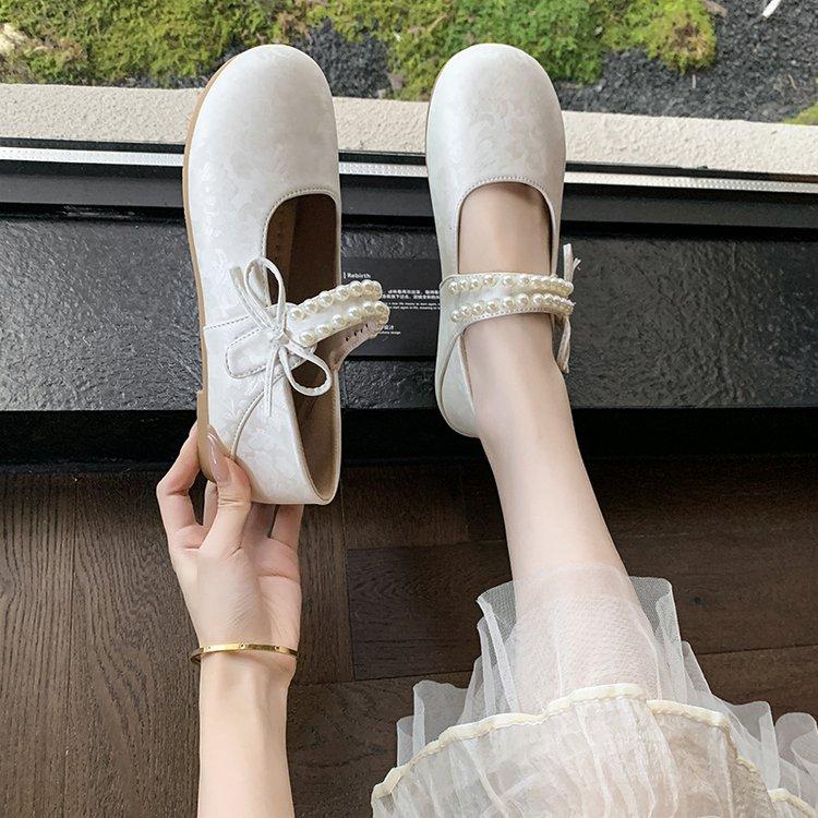 Французские туфли Мэри Джейн с жемчужным бантом женские 2025 новые туфли-лодочки нежного стиля универсальные балетки