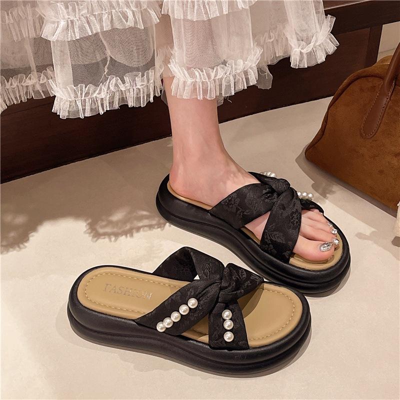 2025 лето новый верхняя одежда жемчуг национальный стиль плоская подошва новые китайские женские пляжные туфли толстая подошва удобные прохладные тапочки