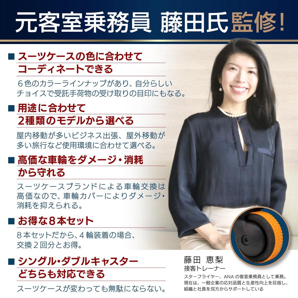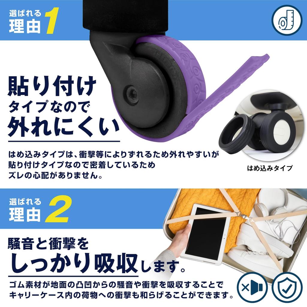 [Тип наклеивания, который не отвалится] Обычные изделия просто защелкиваются на колеса, что делает их склонными к отваливанию и потере во время использования. Однако этот продукт имеет клейкую ленту, которая приклеивается непосредственно к колесам, что делает его более прочным и долговечным.. *Размеры изделия: Высота: 20см, ширина: 1,2 см, толщина: 2,5 мм. При покупке, пожалуйста, проверьте всю окружность ролика и убедитесь, что нет участков, которые будут мешать применению.. Кроме того, перед нанесением убедитесь, что ролик тщательно очищен от грязи, и нанесите его плотно, без зазоров.. [Поглощение шума и ударов] Резиновый материал поглощает удары и шум, создаваемые неровными поверхностями! Наслаждайтесь комфортным использованием. [Защита колес] Защищает колеса, которые наиболее подвержены износу на ручной клади! Наслаждайтесь долговечностью вашего любимого чемодана для ручной клади. [Широкий выбор цветов] Выберите один из шести цветов, чтобы персонализировать свой чемодан для ручной клади! Легко найти свой чемодан для ручной клади в аэропорту, даже на выдаче багажа.. [Под руководством бывшего бортпроводника] Под руководством бывшего бортпроводника Фудзиты! [Два типа на выбор] Теперь доступны два типа крышек для роликов! Внедорожная модель: Ударопрочный даже на неровной поверхности
