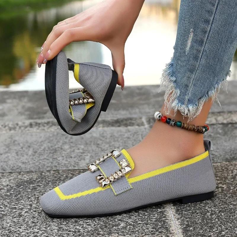 Женская обувь 2025 г., сетчатые женские туфли на плоской подошве, повседневные туфли на плоской подошве больших размеров, женские туфли смешанных цветов с металлическими украшениями и квадратным носком