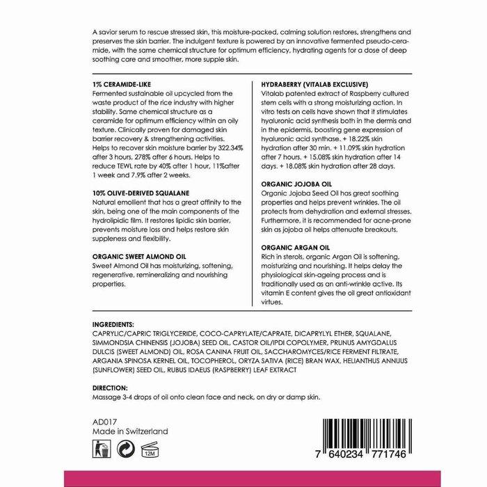 ingredients : Caprylic/Capric Triglyceride, Coco-Caprylate/Caprate, Dicaprylyl Ether, Squalane Simmondsia Chinensis (Jojoba) Seed Oil, Castor Oil/LPDI Copolymer, Prunus Amygdalus Dulcis (Sweet Almond) Oil, Rosa Canina Fruit Oil, Saccharomyces/Rice Ferment Filtrate, Argania Spinosa Kernel Oil, Tocopherol, Oryza Sativa (Rice) Bran Wax, Helianthus Annuus (Sunflower) Seed Oil, RubusIdaeus (Raspberry) Leaf Extract.