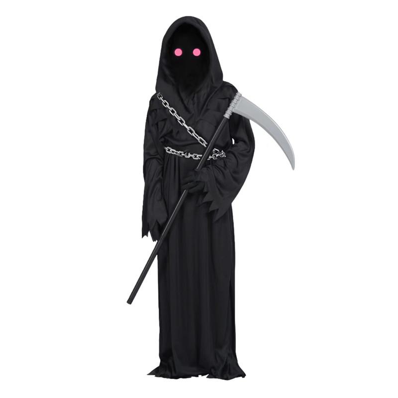 Детский костюм черного красного дьявола с цепью Хэллоуин Красный глаз Мрачный жнец Ужас Игровой костюм Жуткий кос Роба Серп Цепь Перчатки Реквизит