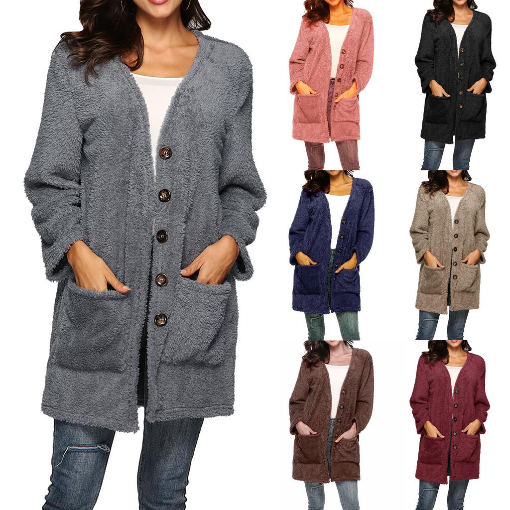 Женское И Зимнее Свободное Однотонное Стеганое Пальто с Длинными Рукавами и V-образным Вырезом на Одной Пуговице с Карманами