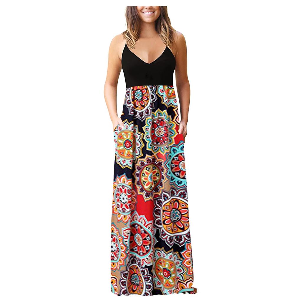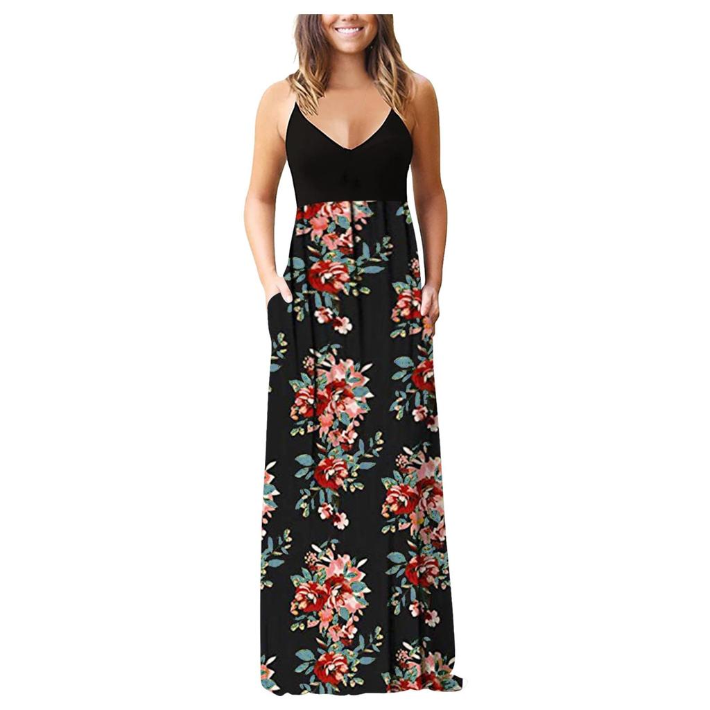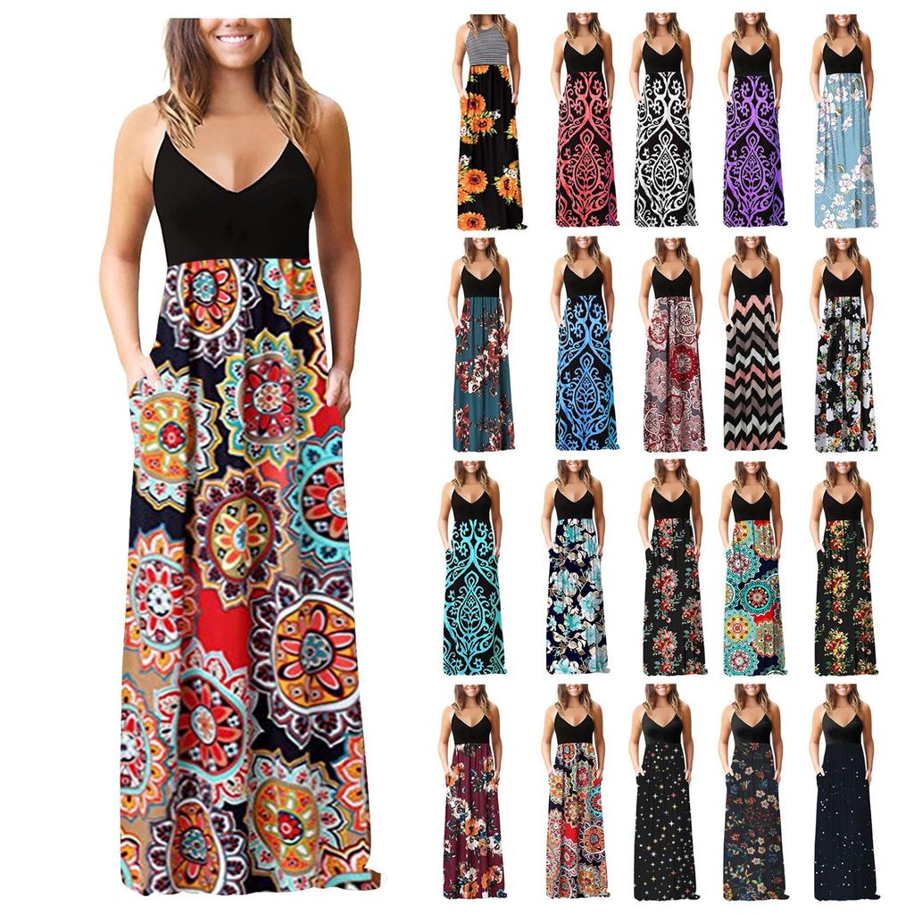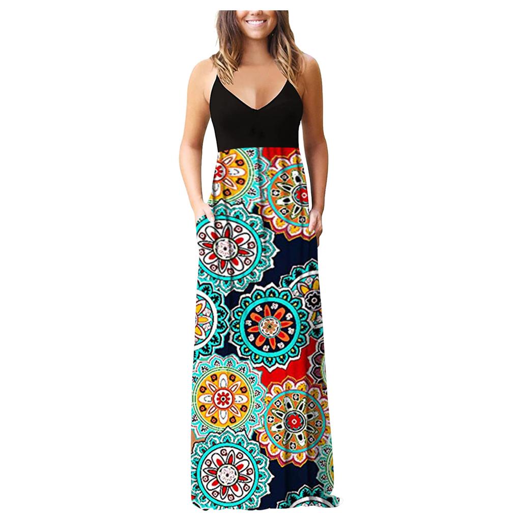 Женское платье макси без рукавов с принтом, V-образным вырезом, летнее платье-комбинация для вечеринки с карманами