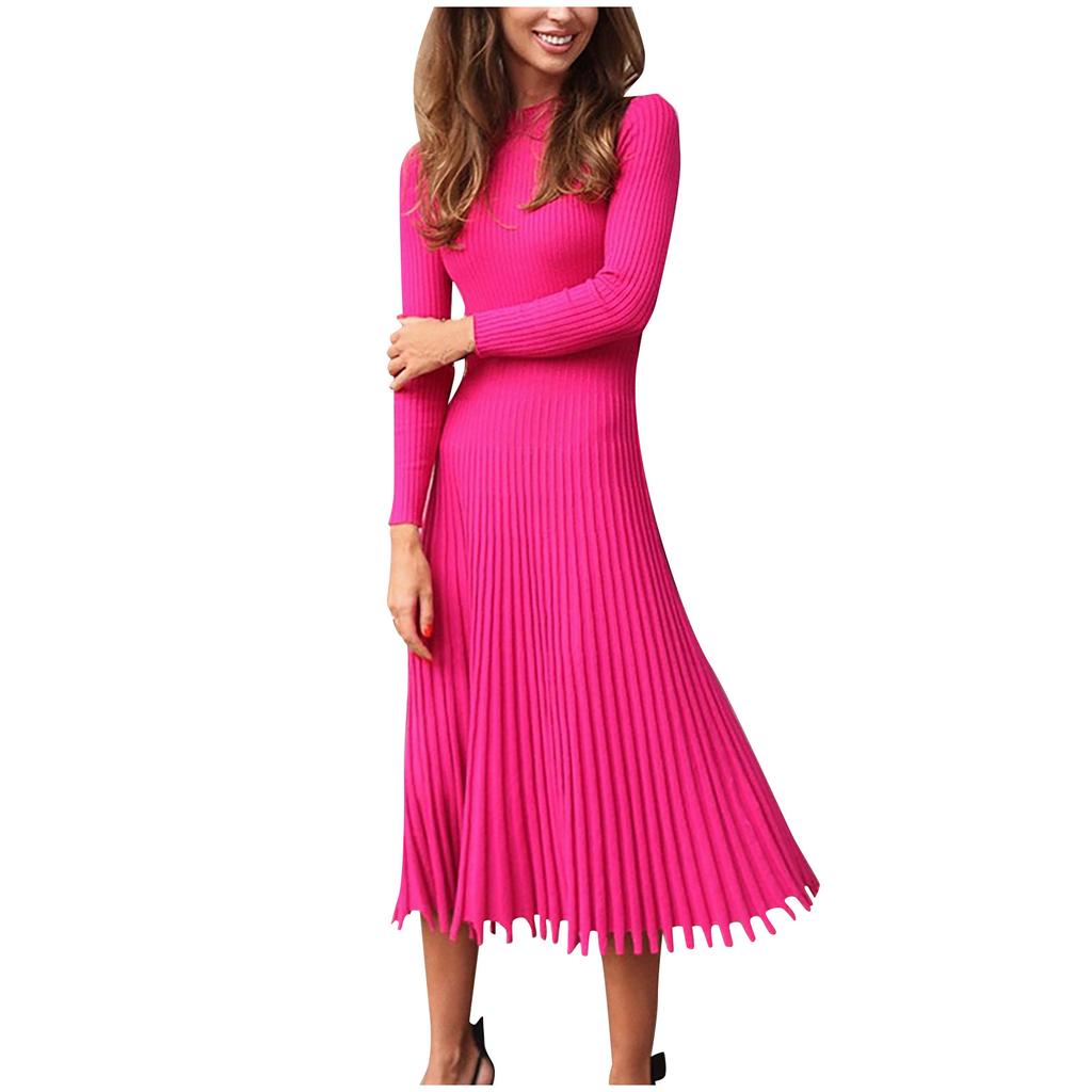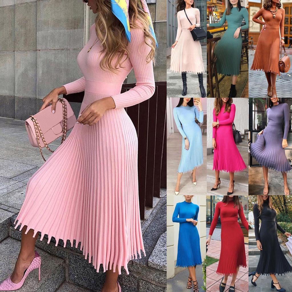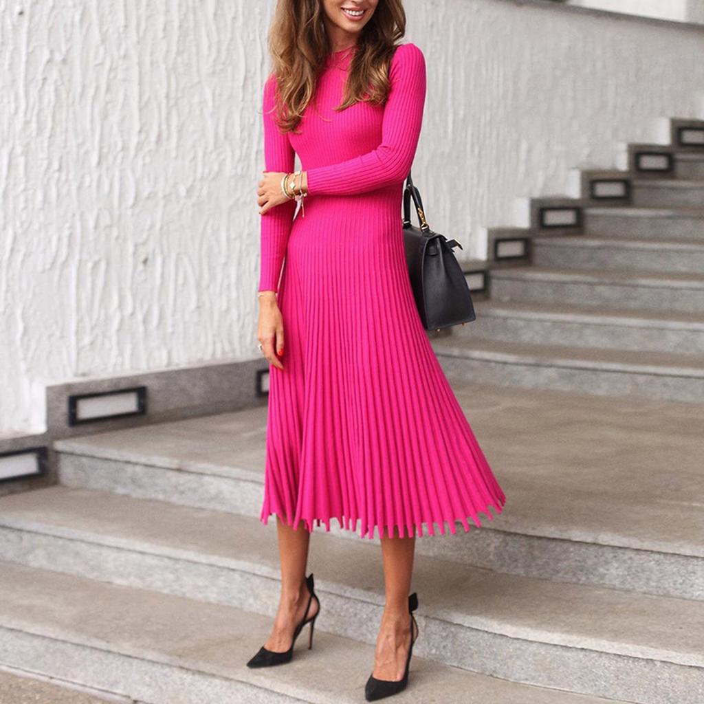 Модное женское однотонное трикотажное платье с длинными рукавами и плиссированным платьем