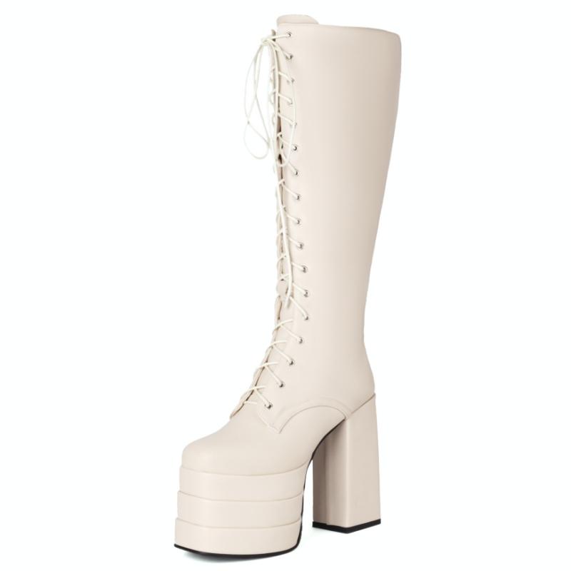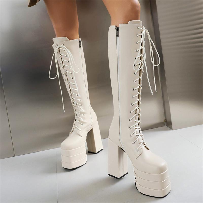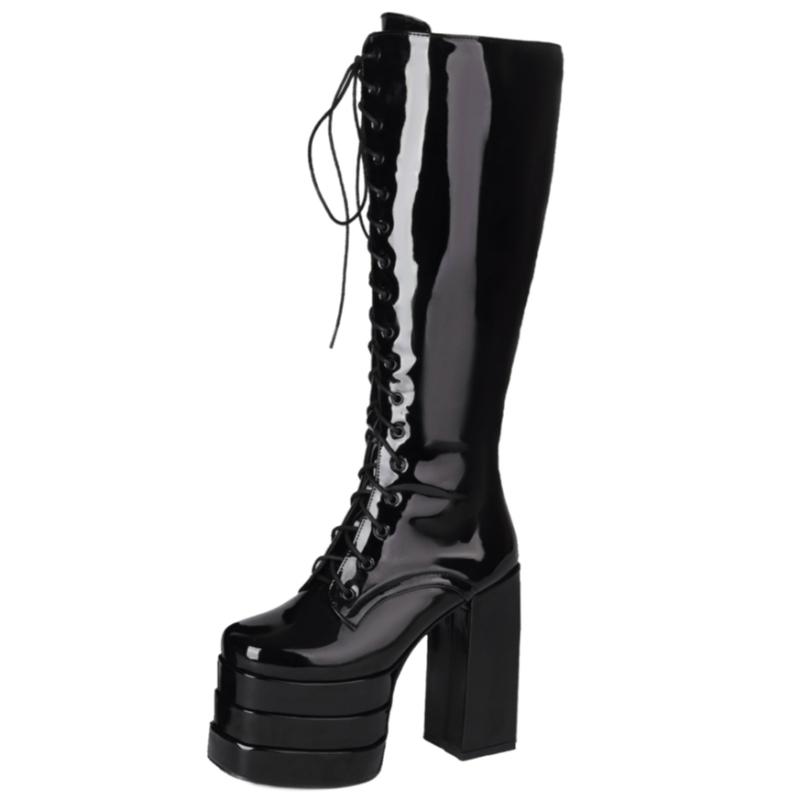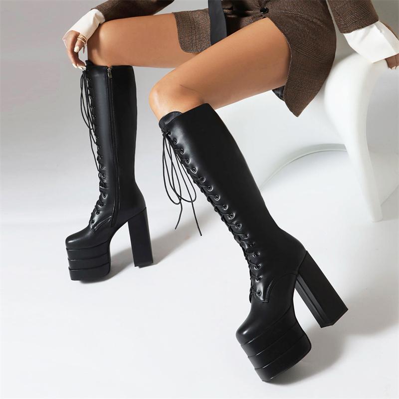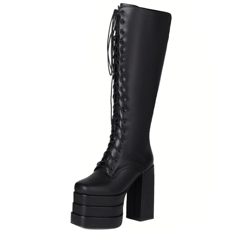 Сексуальные панк-сапоги до колена на платформе, готические черные зимние ботинки на высоком каблуке, кожаные, со шнуровкой, фетиш-туфли для стриптиза, женские, большого размера 45