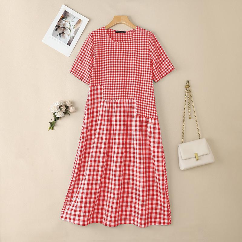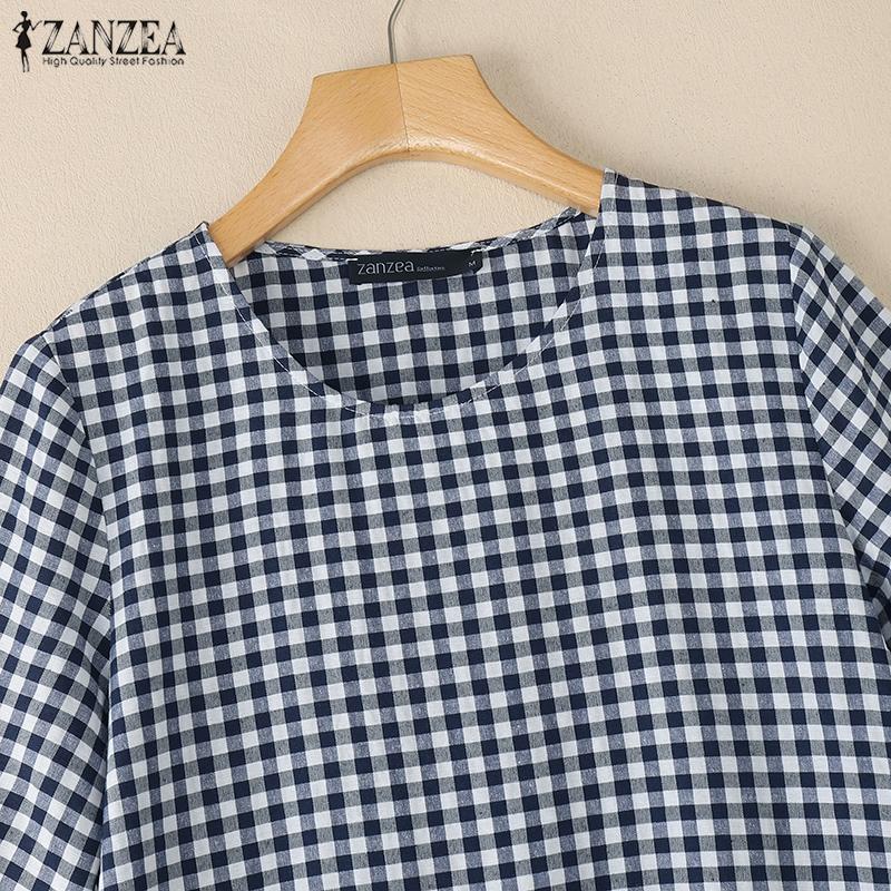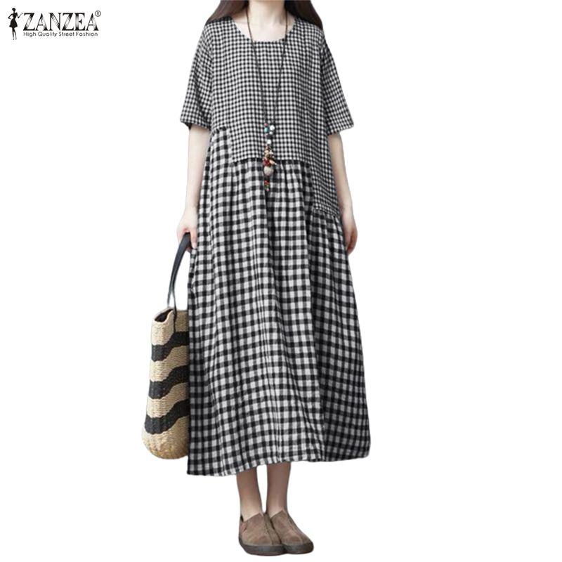 ZANZEA Женское летнее повседневное платье с принтом в клетку, с круглым вырезом и рукавом до локтя