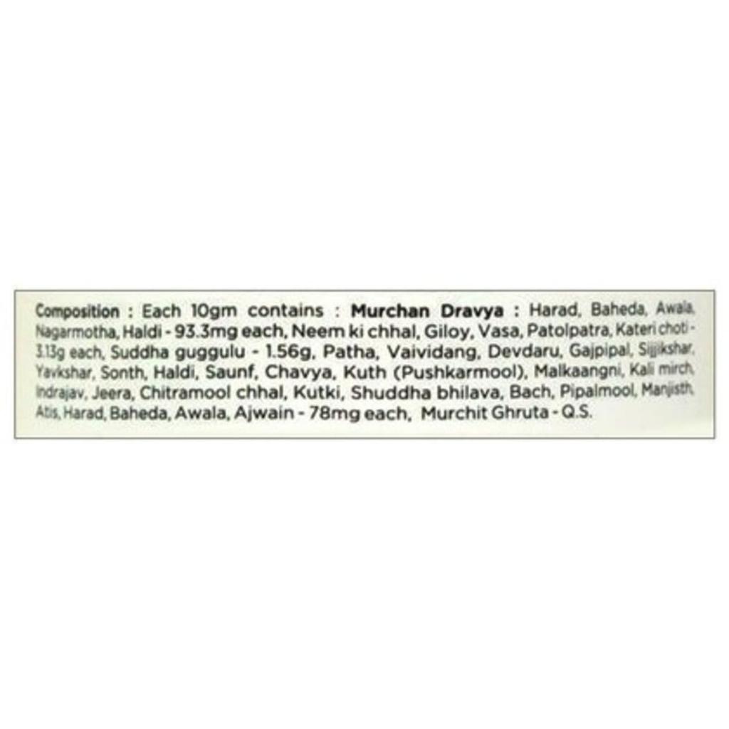 paribhader (neem), atish meetha, ajwayan, aawala kali, baheda chhilka, harad badi, manjishtha, pipla mool, vach, shudha bhilava, kutki, chitrak mool, jeera safed, indra jau, mirach kali, malkangni, pushkar mool, chyavya, souph, haldi, sounth, yavak shar, sajjikshar, pipal, deodaru guliya, vayvidang, sona chhal, ghrut (ghee), guggul, jal shesh, jal, kateri chhoti, patol patra, adusa patti, giloya sukhi
