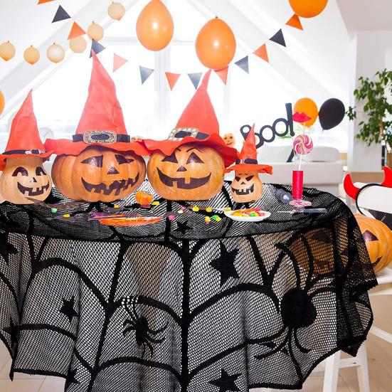 Основные акценты Хэллоуина: Дополните ваше хэллоуинское оформление необходимыми декоративными элементами, включая скатерти из черного кружева в виде паутины, каминные шарфы в виде паутины и хэллоуинские абажуры.. Эти предметы могут украшать окна, столы, камины, кухни, дворы или любое другое желаемое место для создания охлаждающего эффекта.