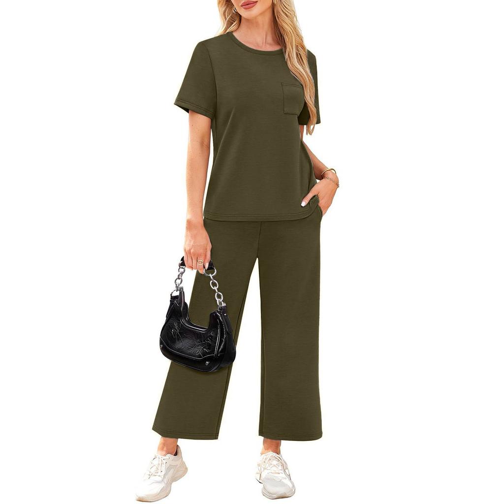 Женский повседневный модный свободный костюм с коротким рукавом и широкими брюками с круглым вырезом