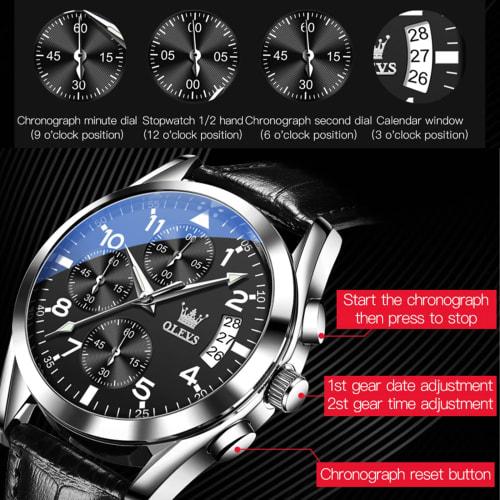 - Мужские кварцевые часы OLEVS Содержимое набора: В комплект входят часы, коробка и инструкция по эксплуатации. Популярные повседневные мужские часы с аналоговым кварцевым механизмом. (батарея в комплекте).Функциональный хронограф (24-часовой счетчик, 60-минутный счетчик, 60-секундный счетчик); отображение даты.