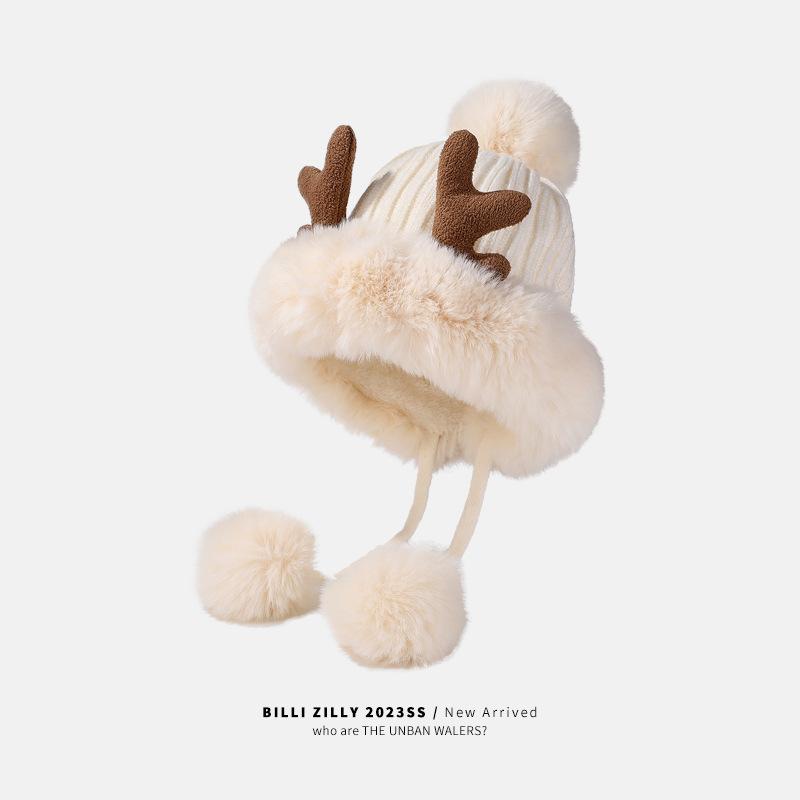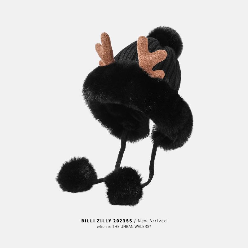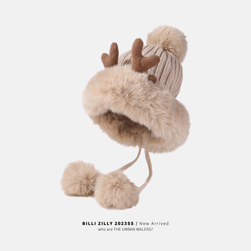 Корейская версия новой женской модной универсальной бархатной утолщенной шапки с помпоном в виде рогов, вязаной шапки для студентов, для велоспорта, с защитой ушей, шерстяной шапки