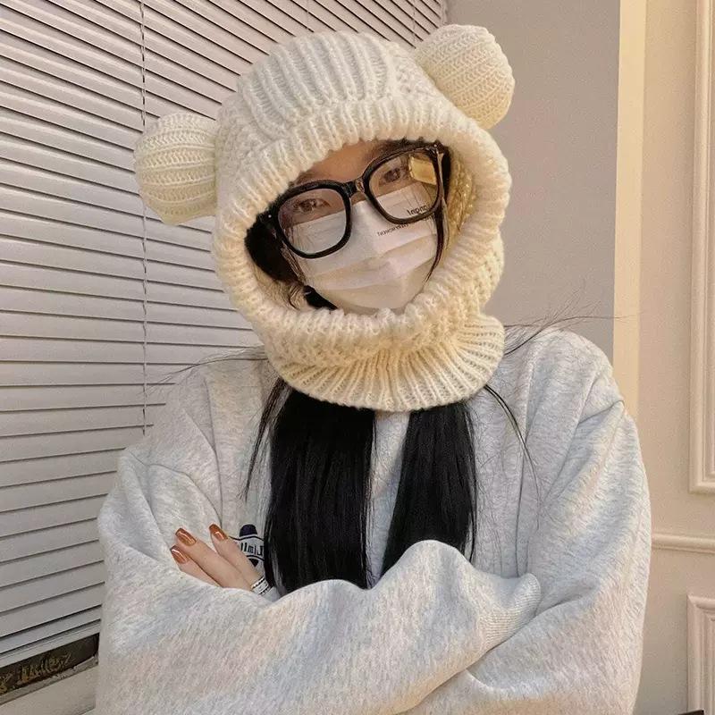 Шапка с медвежьими ушками, шарф, интегрированная шапка, женская зимняя универсальная защитная шапка-балаклава, вязаная шерстяная шапка Tide