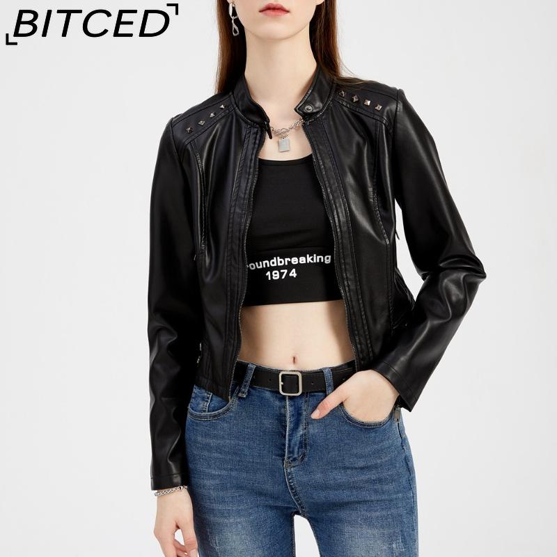 BITCED Women's Studded Leather Jacket Spring/Autumn Long-Sleeved Stand-Collar Fashion Jacket — купить товар онлайн с бесплатной доставкой по всему миру!