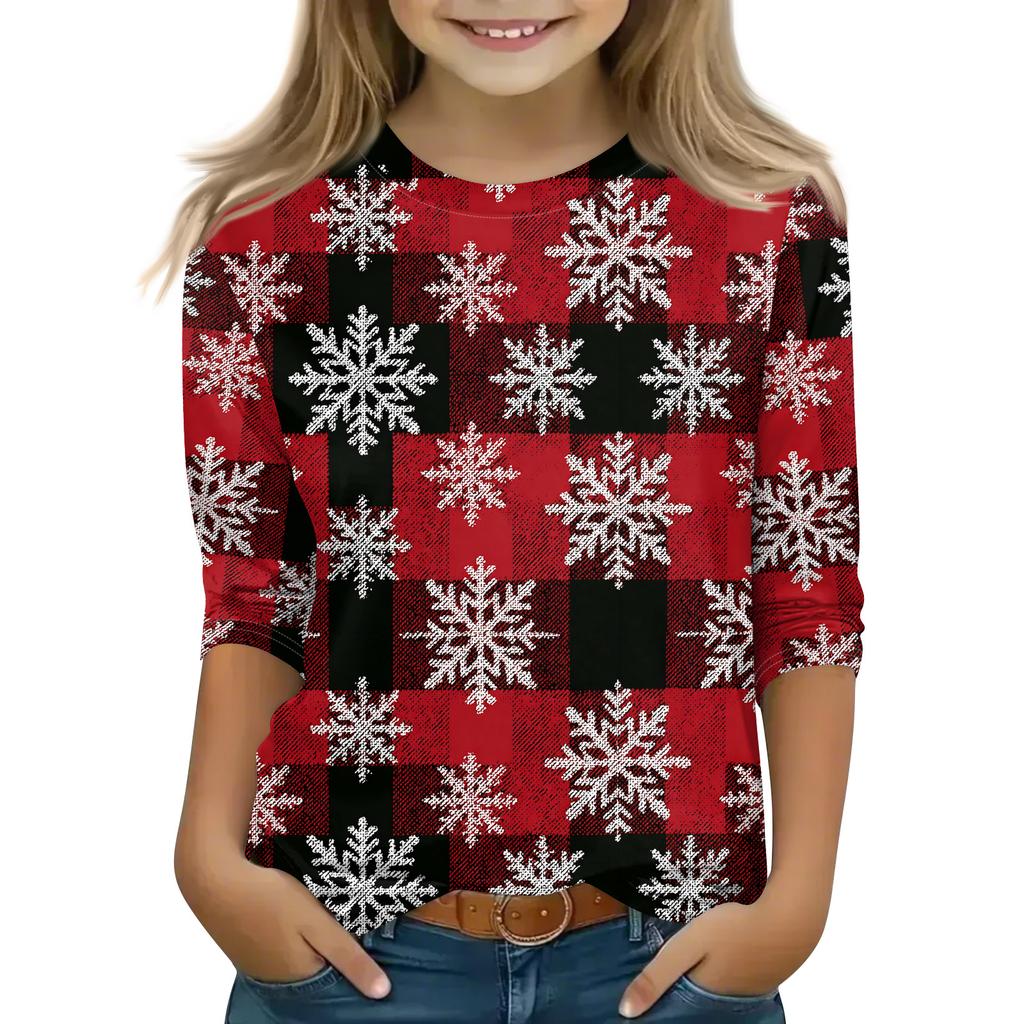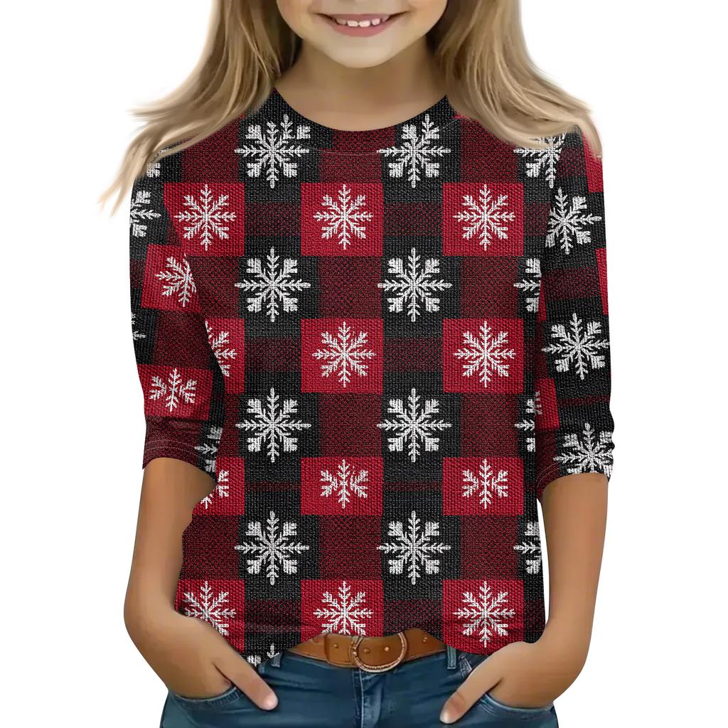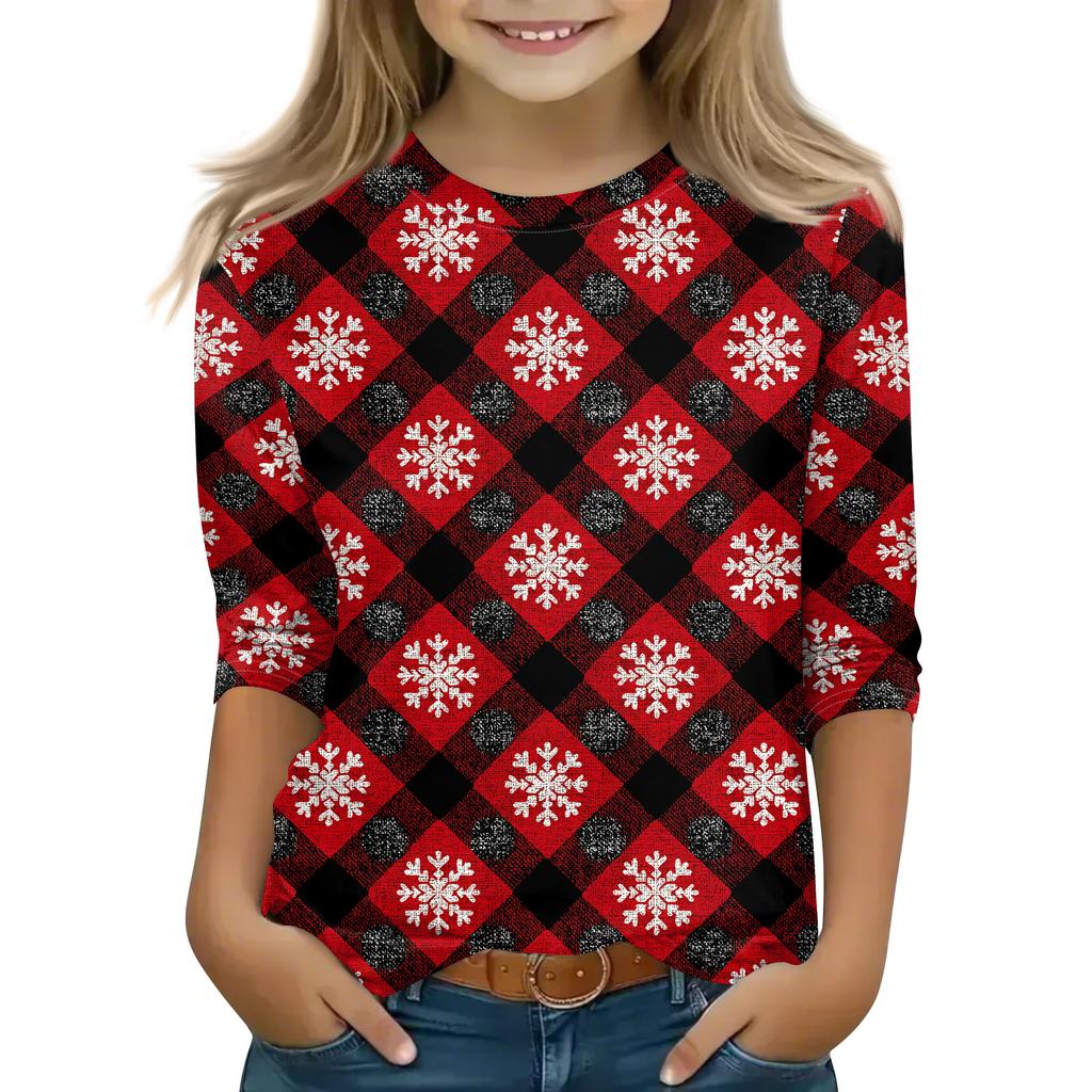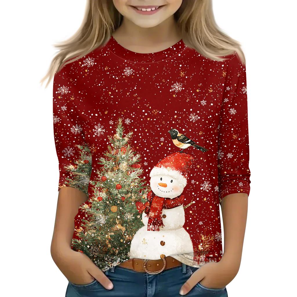Рождественские топы с принтом для девочек-подростков 4-11 лет, футболки с круглым вырезом и рукавами 3/4, модные топы, нарядные футболки