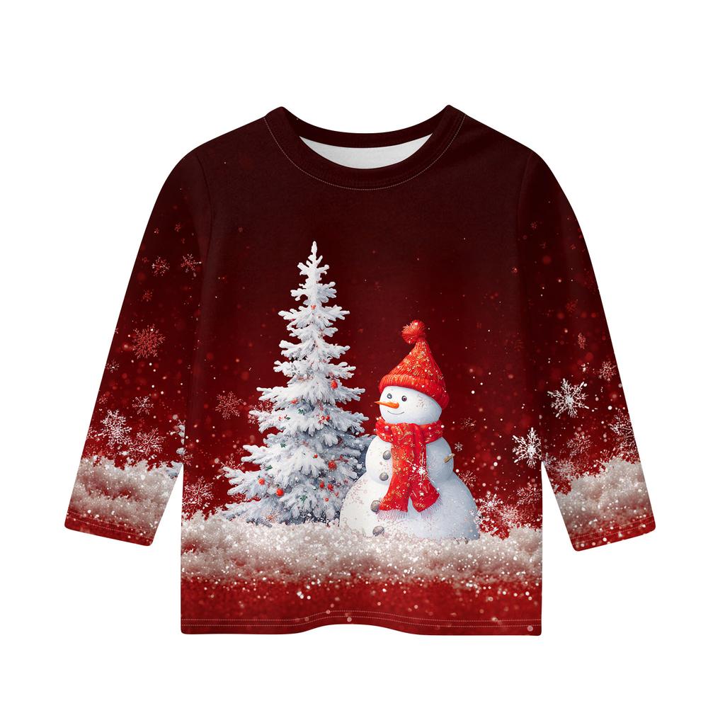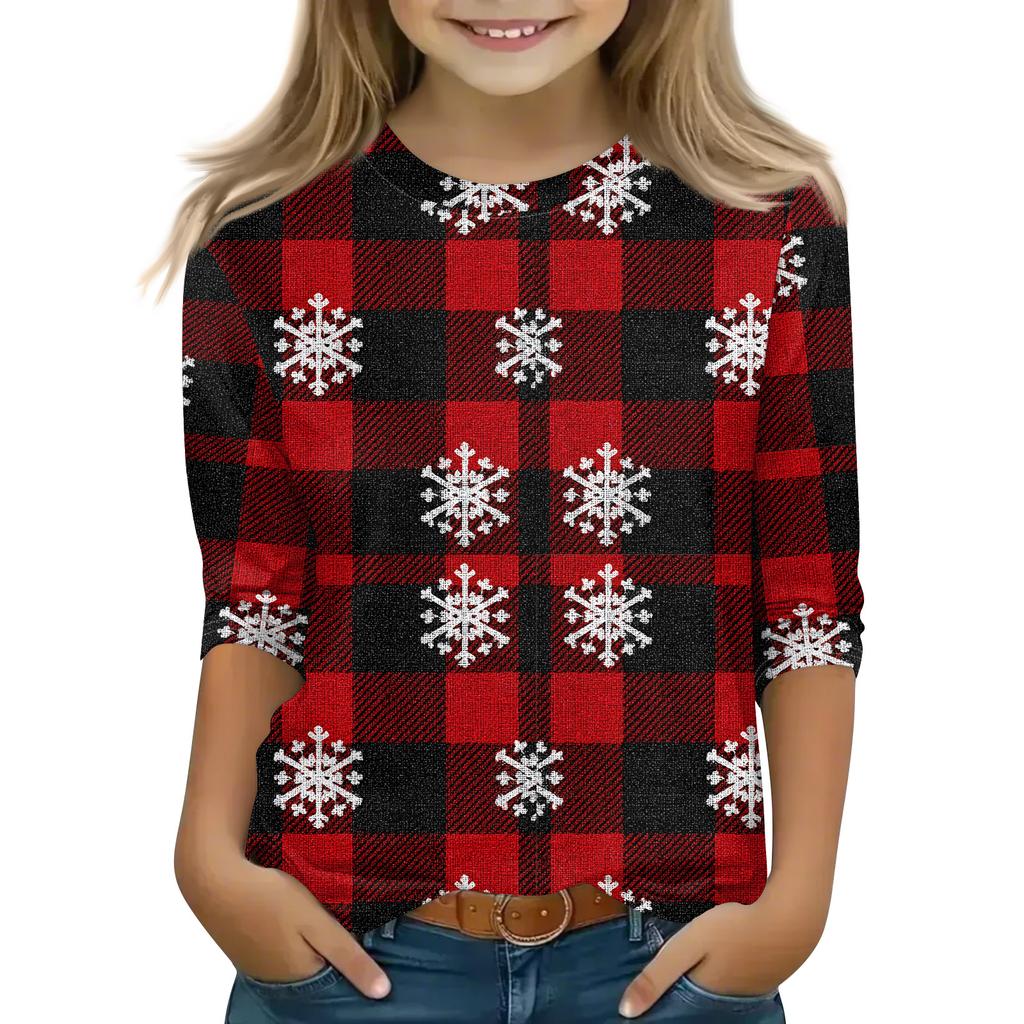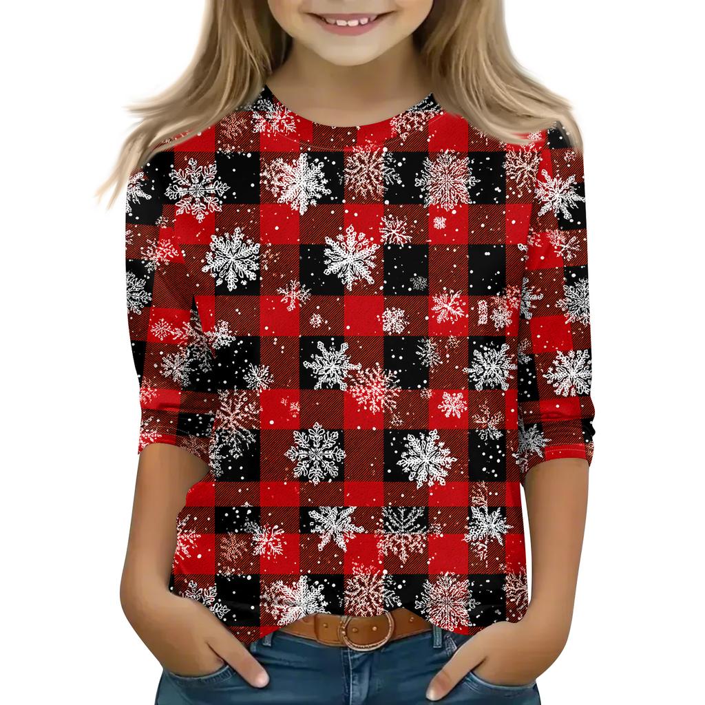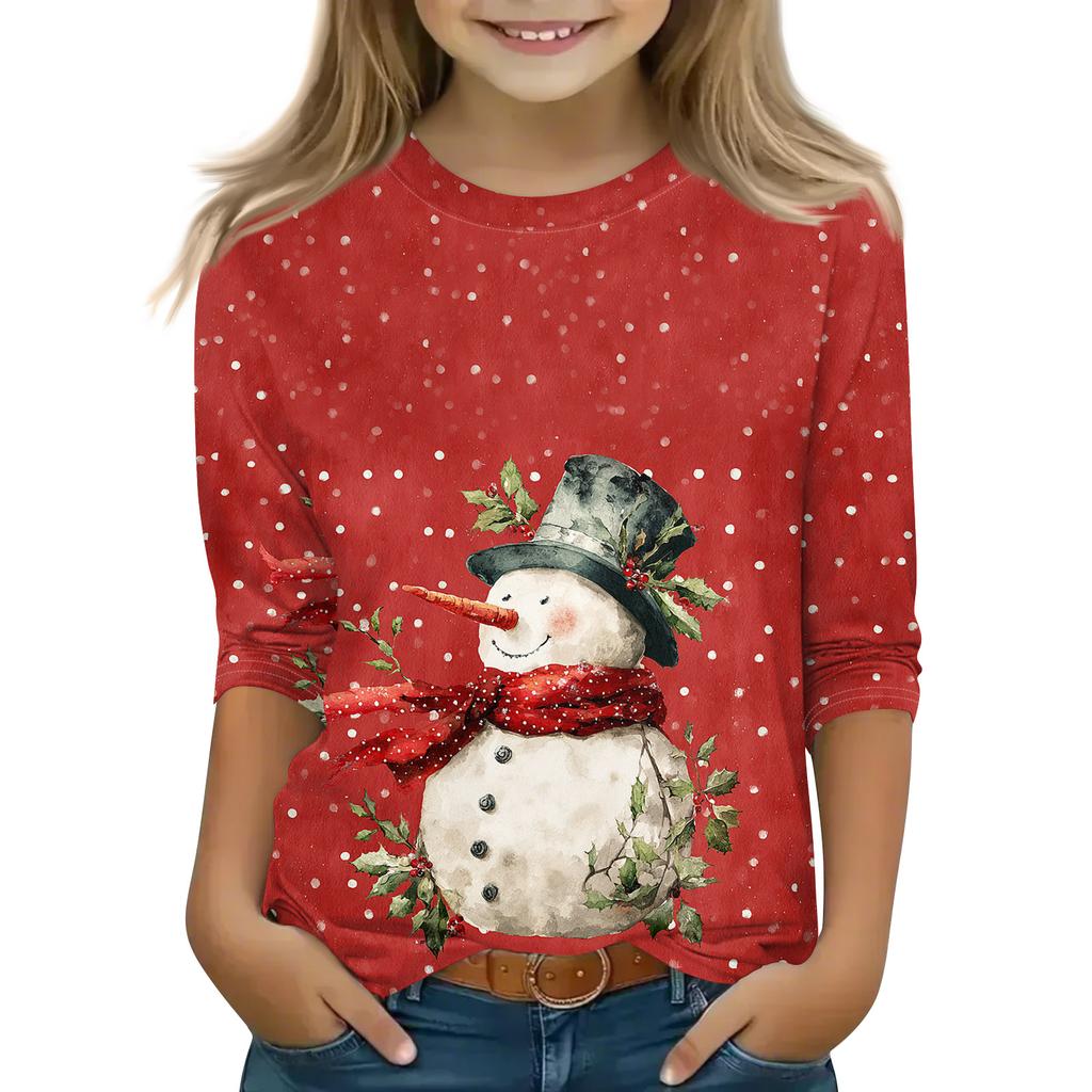 Рождественские топы с принтом для девочек-подростков 4-11 лет, футболки с круглым вырезом и рукавами 3/4, модные топы, нарядные футболки