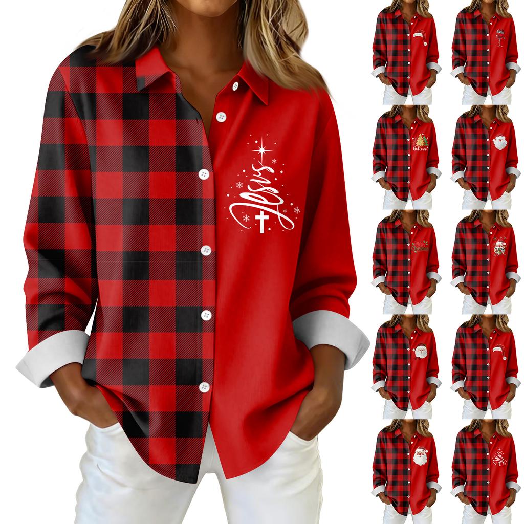Женская рубашка-блузка с рождественским принтом и пуговицами, длинный рукав, повседневный базовый рубашечный воротник, обычный топ