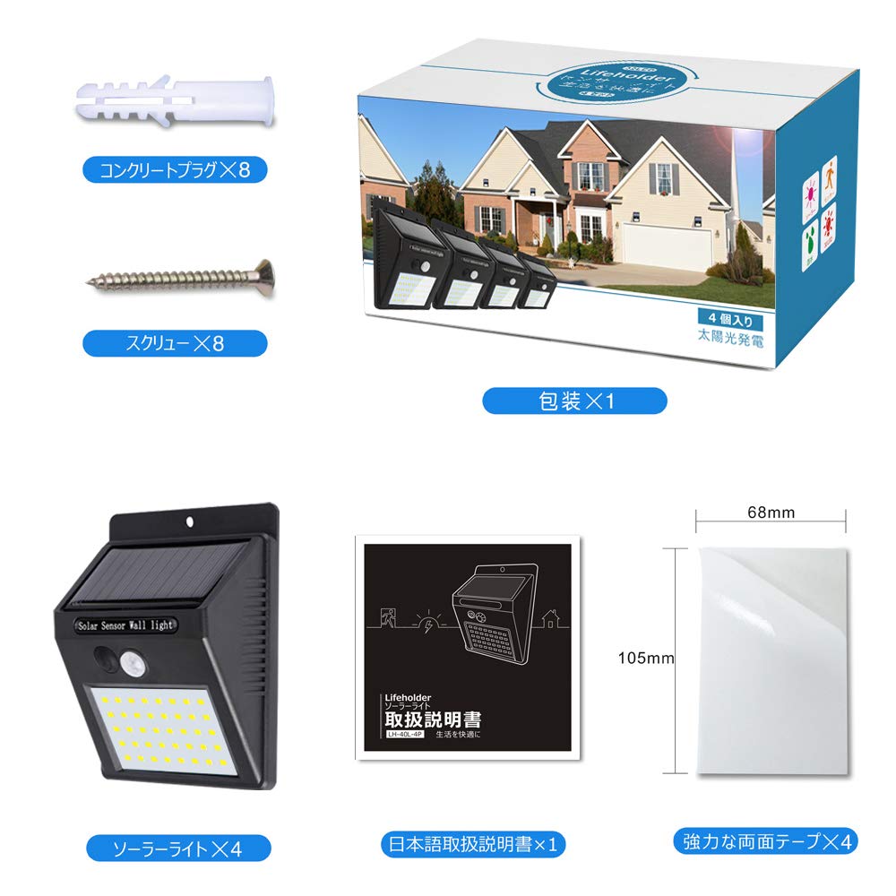 Lifeholder 40 LED Солнечный датчик движения Солнечное наружное освещение для парковки Лента Легкий набор из 4 фонарей, Свет, Питание, Входы, Карнизы, Участки, Водонепроницаемый,