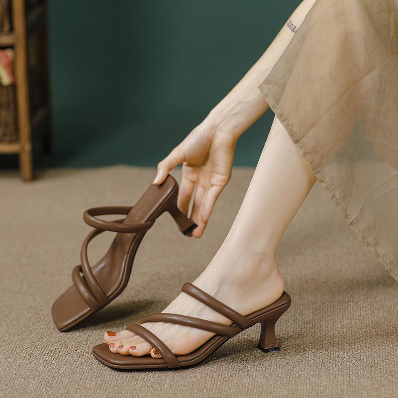 Французские тапочки женская верхняя одежда мода 2025 новый летний квадратный носок тонкий каблук сказочный стиль высокий каблук однословные крутые тапочки