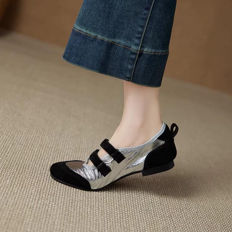 Версия из коровьей кожи~ Французский ретро-стиль, сочетание цветов, туфли Мэри Джейн с легким вырезом, новинка 2025 года, повседневные балетки с круглым носком