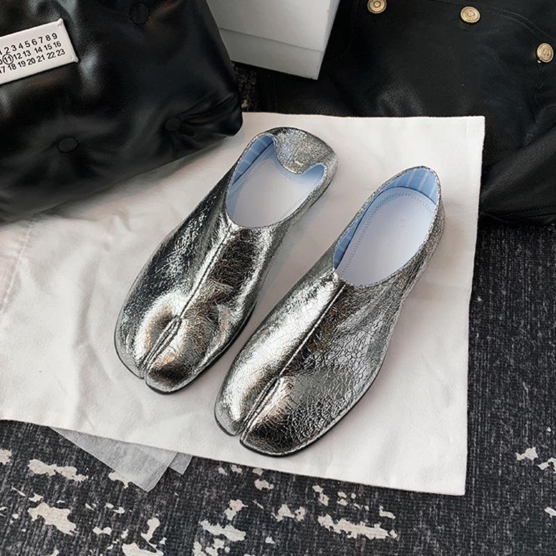 Виноградные копытца туфли с раздвоенным носком женские 2025 лето новые серебристые туфли-подковы ленивые на одной педали плоская подошва с мелким вырезом одинарные