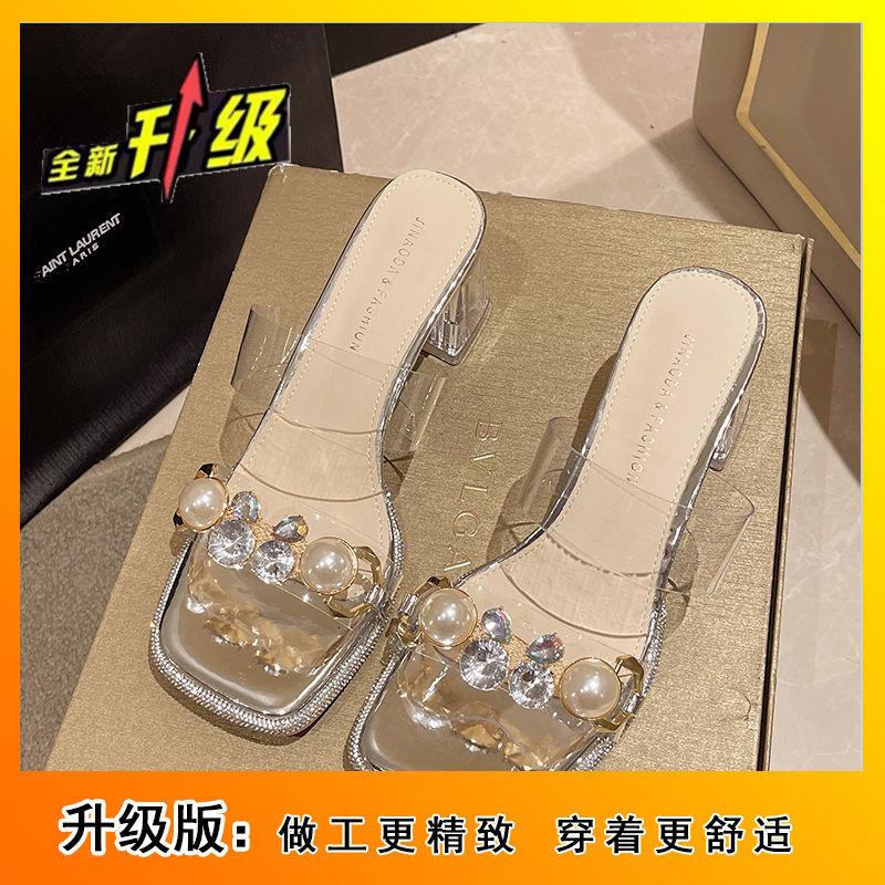 Прозрачные туфли на высоком каблуке, толстый средний каблук, открытые носки, женская обувь, верхняя одежда 2025 года, лето с босоножками из жемчуга и стразами