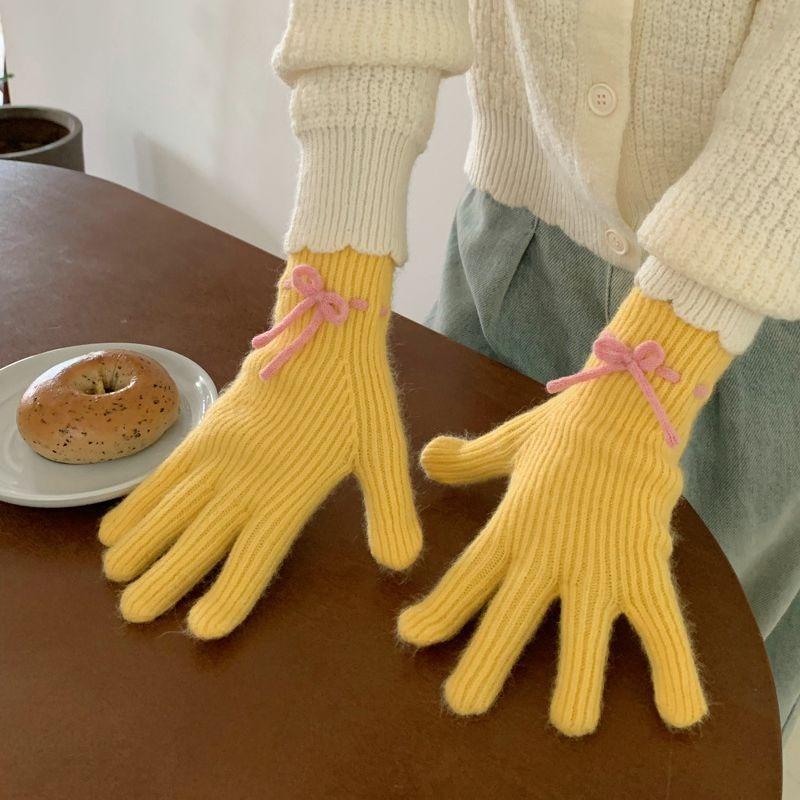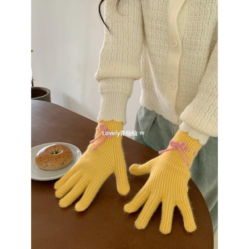 Студенческие теплые перчатки для езды осенью и зимой, милые вязаные перчатки с бантом, женские студенческие перчатки с пальцами