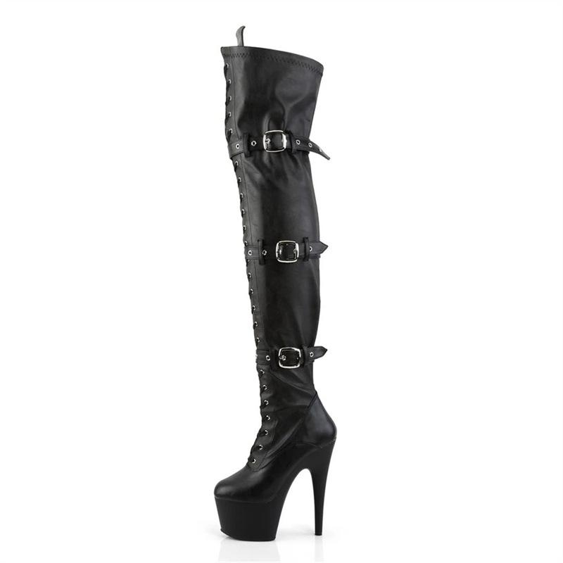 17СМ Ботфорты выше колена | Панк-рок ботинки для танцев на пилоне | Черные на шнуровке с ремешком с пряжкой | Нескользящая сценическая обувь для клубной ночи
