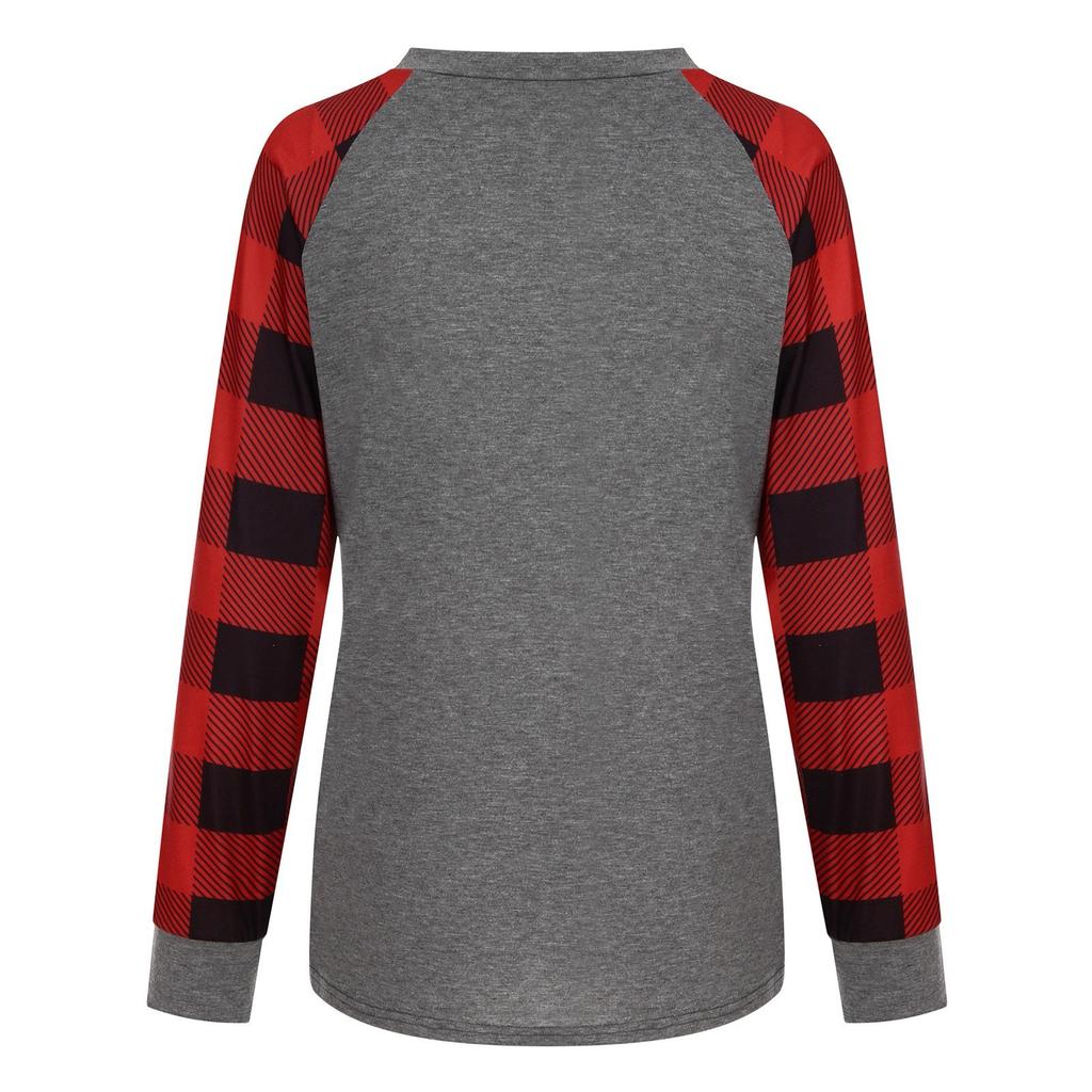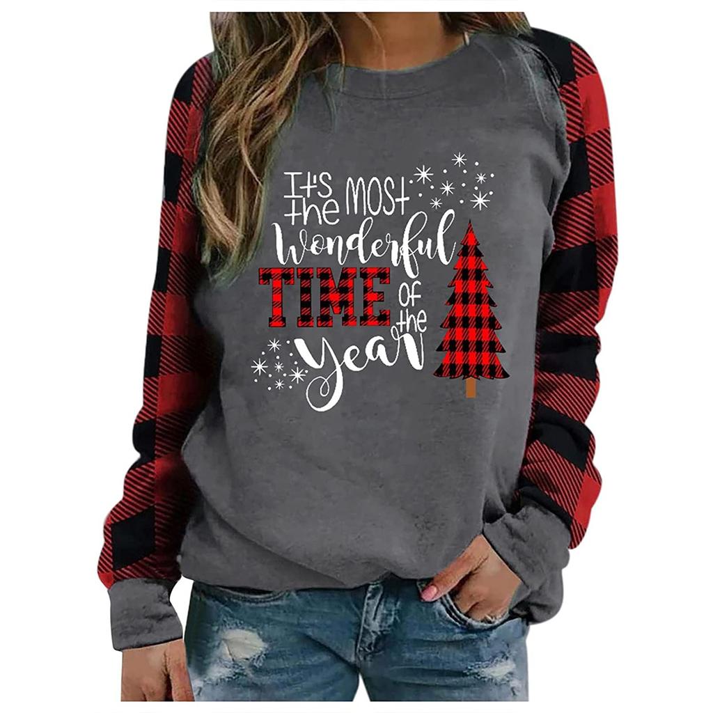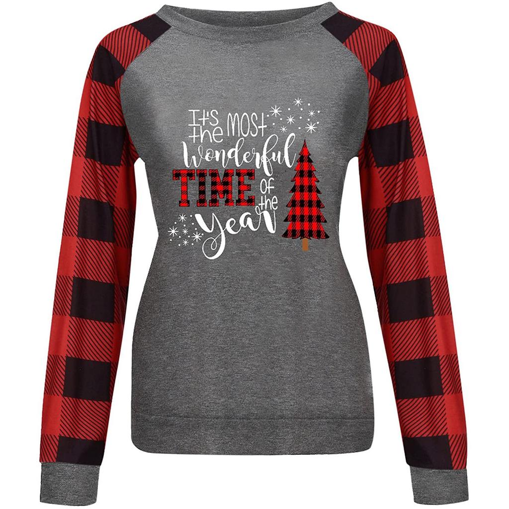 Женская модная клетчатая лоскутная футболка с рождественским принтом и круглым вырезом, длинным рукавом, топ