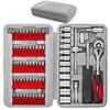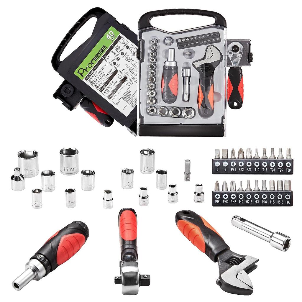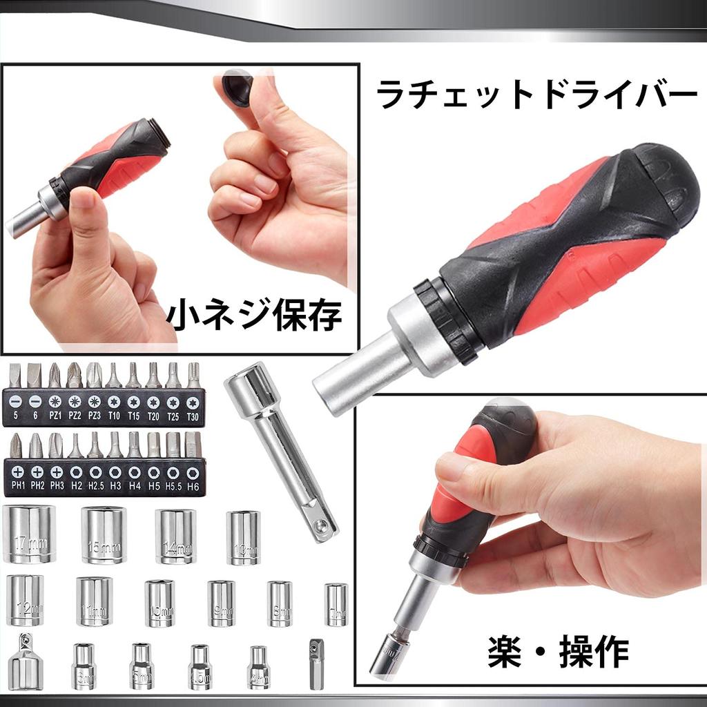 [Рекомендуемые моменты] ≪1≫ Реверсивная трещоточная рукоятка, совместимая с 6,35 мм (1/4 дюйма) и 9,5 мм (3/8 дюйма) Розетки. Он также оснащен 72-зубчатым механизмом, обеспечивающим точное движение и отличный доступ в труднодоступных местах.. «2» Разводной ключ компактный и легкий (с масштабом), весит всего 208 г, несмотря на максимальный зев 27 мм, что делает его идеальным для доступа в труднодоступные места. ≪3≫ Задняя часть трещоточной отвертки полая, что позволяет временно хранить мелкие винты и болты.. ≪4≫ Этот всеобъемлющий набор из 40 предметов избавляет от необходимости покупать инструменты по отдельности.