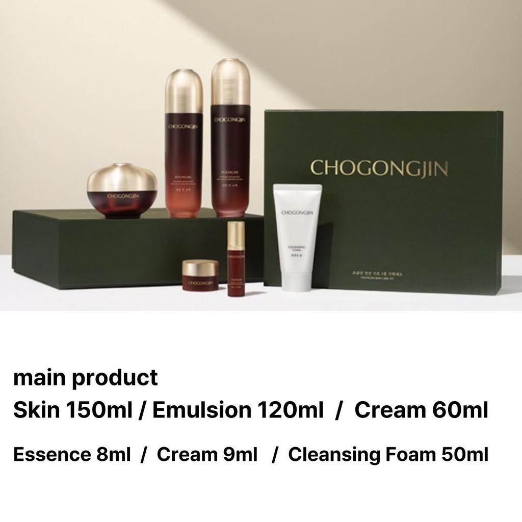 Тонер 150 мл, Эмульсия 120 мл, Крем 60 мл, Эссенция 8 мл / Крем 9 мл / Очищающая пенка 50 мл