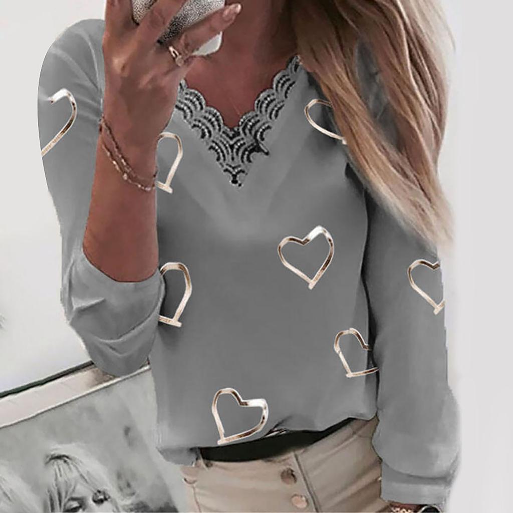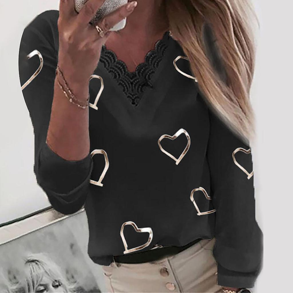 Женская футболка с v-образным вырезом и принтом в виде сердечек, кружевная лоскутная футболка с длинным рукавом, верхняя блузка