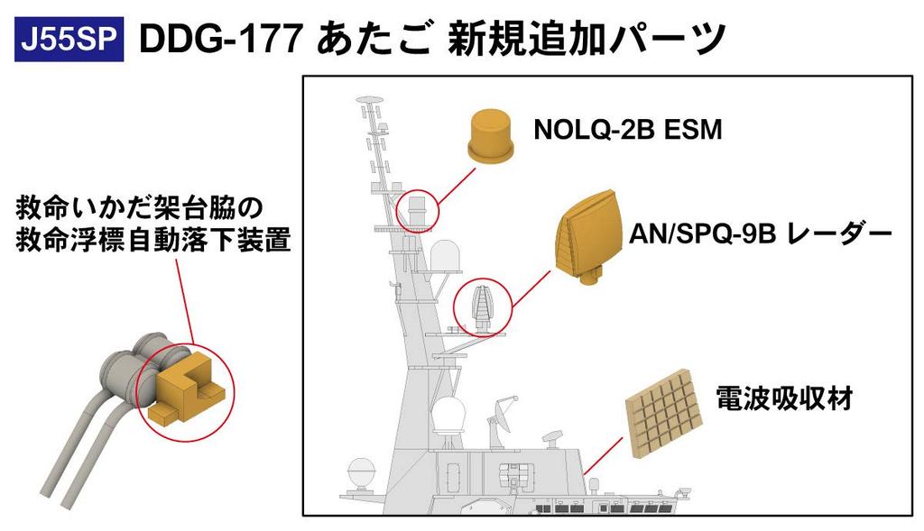 Newly added parts: AN/SPQ-9B radar, NOLQ-2B ESM, radio wave absorber, automatic life buoy drop device