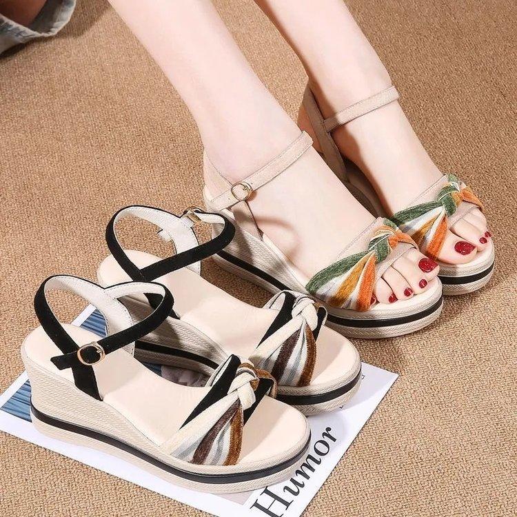 Slope heel leather sandals women's 2025 summer new versatile buckle with high heel thick sole heightening casual outer slippers — купить товар онлайн с бесплатной доставкой по всему миру!