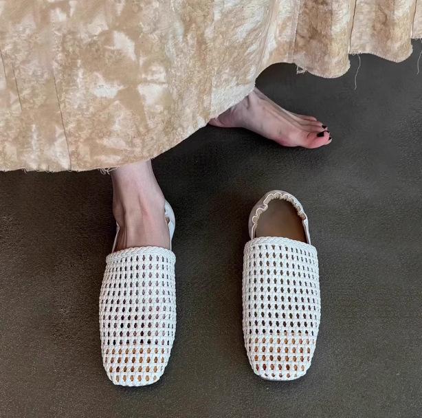 Версия из коровьей кожи нишевая ретро плетеная полая дышащая сумка каблук одинарная обувь женская квадратный носок один педаль универсальные ленивые плоские туфли