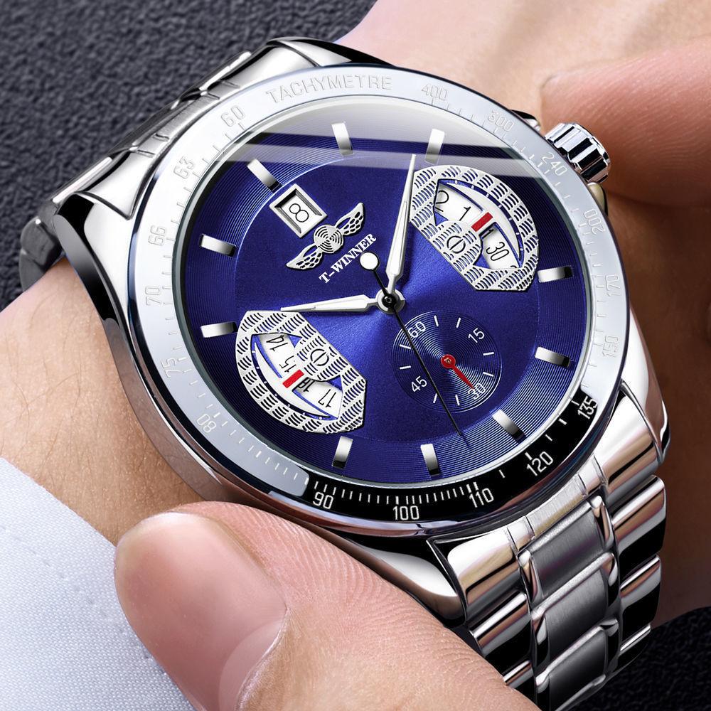 WINNER Sports Gold Automatic Watch for Men Date Display Luminous Hands Stainless Steel Strap Top Brand Luxury Mechanical Watches — купить товар онлайн с бесплатной доставкой по всему миру!