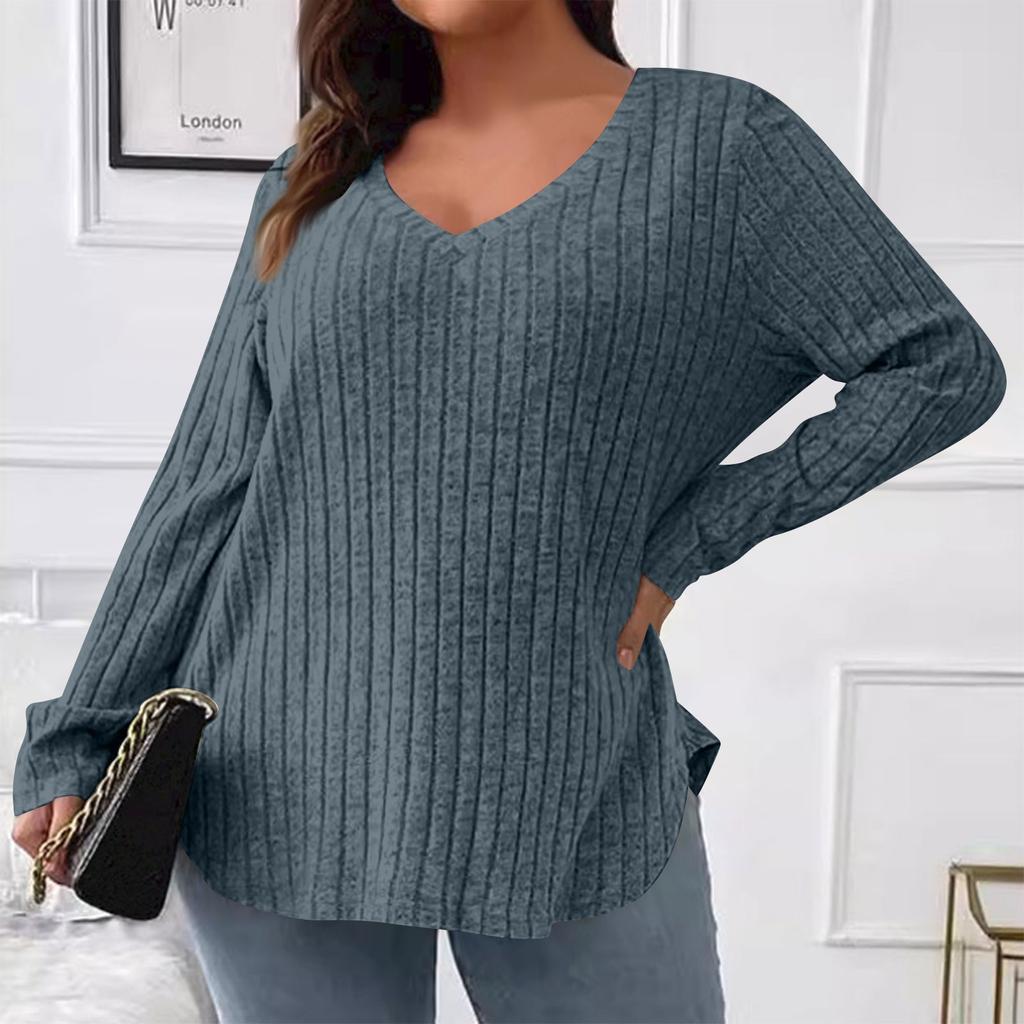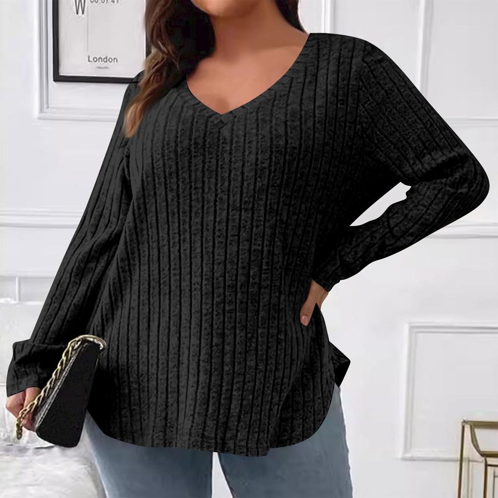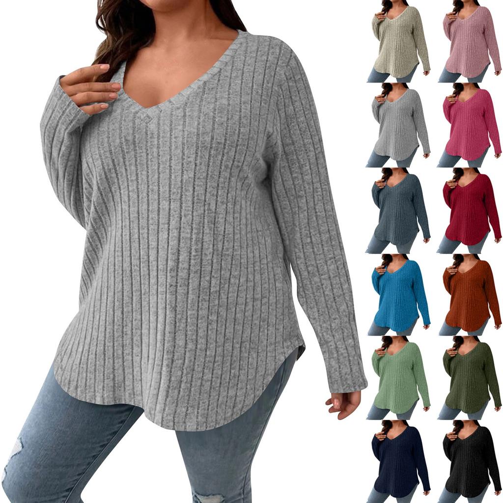 Женский осенне-зимний однотонный топ большого размера с V-образным вырезом и длинными рукавами в полоску, свободный пуловер, футболка
