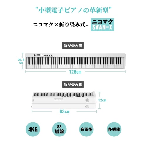 - Складное электронное пианино = SWAN-X рождение В этот раз, с еще большим акцентом на компактность, мы представили технологию складного электронного пианино. Размер до складывания: 126*20,9*6см, размер после складывания: 63*20.9*12см 4КГ, перезаряжаемый Суперлегкий, примерно 4 кг, легко для детей носить!Он оснащен встроенным аккумулятором большой емкости и может использоваться в течение длительного времени, что делает его идеальным для уроков игры на фортепиано и занятий в дороге.