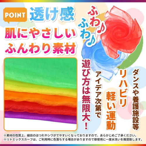 - Rhythmic scarves are made of soft, transparent material that can be used for a variety of purposes depending on your ideas, such as dancing, rhythmic music, playing tag by attaching them to your butt, play accessories, nursing care, light exercise in nursing homes, rehabilitation, etc.