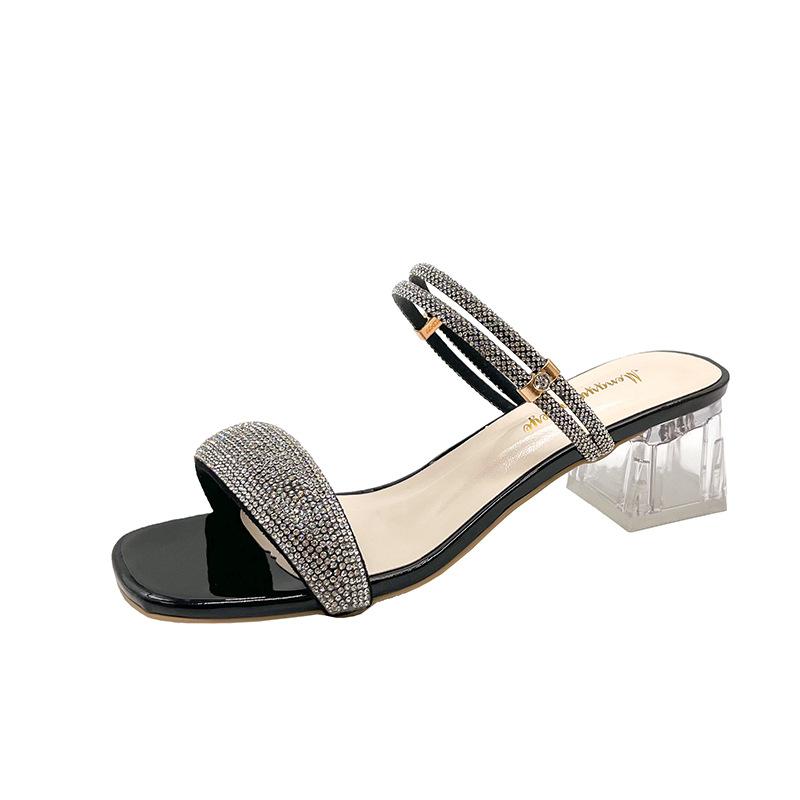 2025 новые летние босоножки на высоком каблуке с одним словом, со стразами, с открытым носком, на толстом каблуке, с квадратным носком, женские босоножки среднего и высокого размера