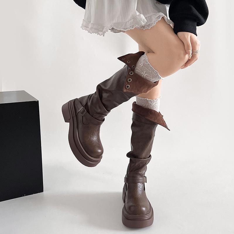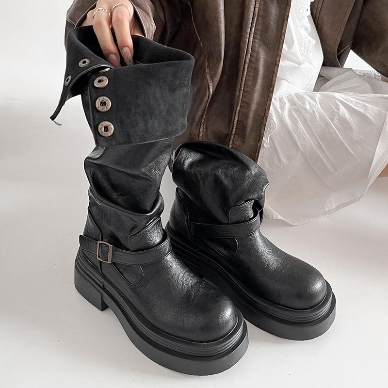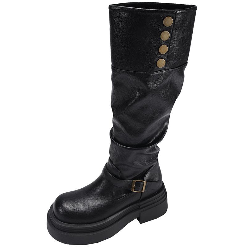 Черные сапоги на толстом каблуке и платформе в ретро-британском стиле для женщин, новинка сезона весна-осень 2025 года, увеличивающие рост, и тонкие рыцарские сапоги
