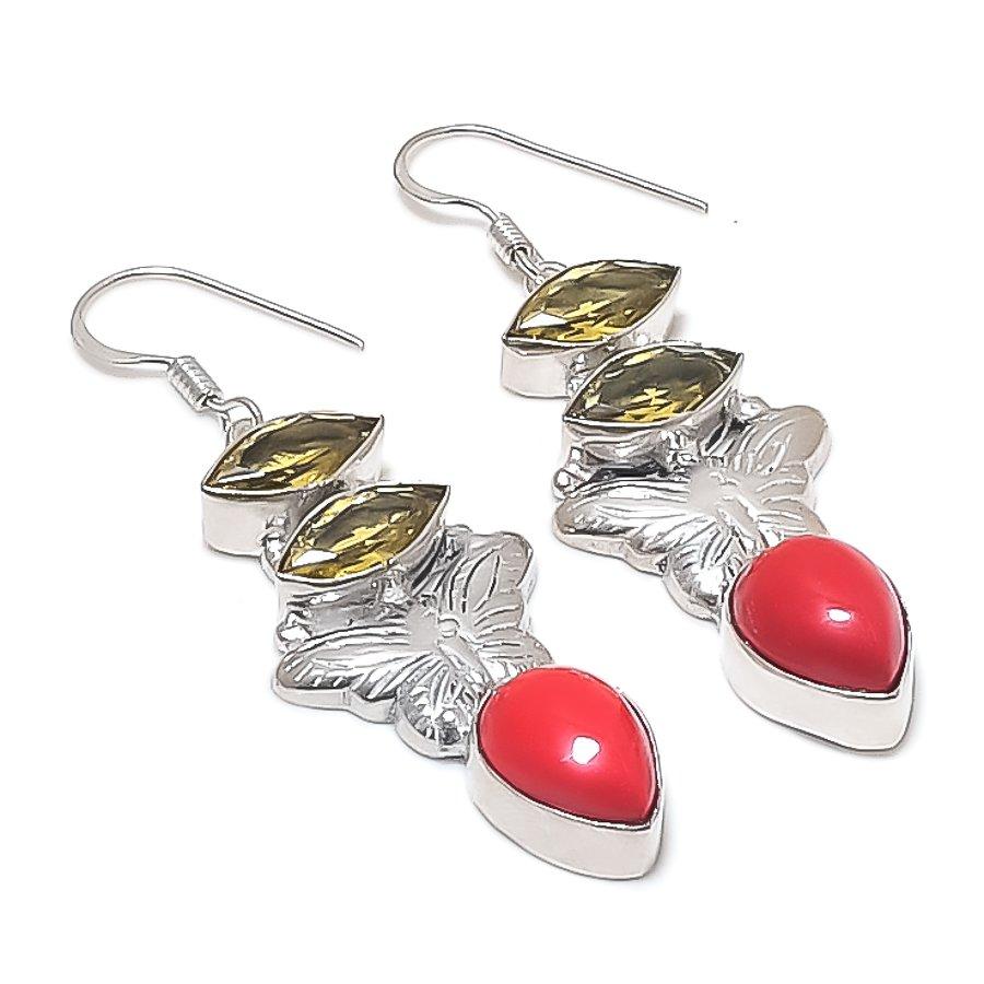 Natural Red Coral, Citrine Gemstone 925 Sterling Silver Earring 2.36" J9J17