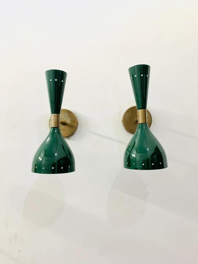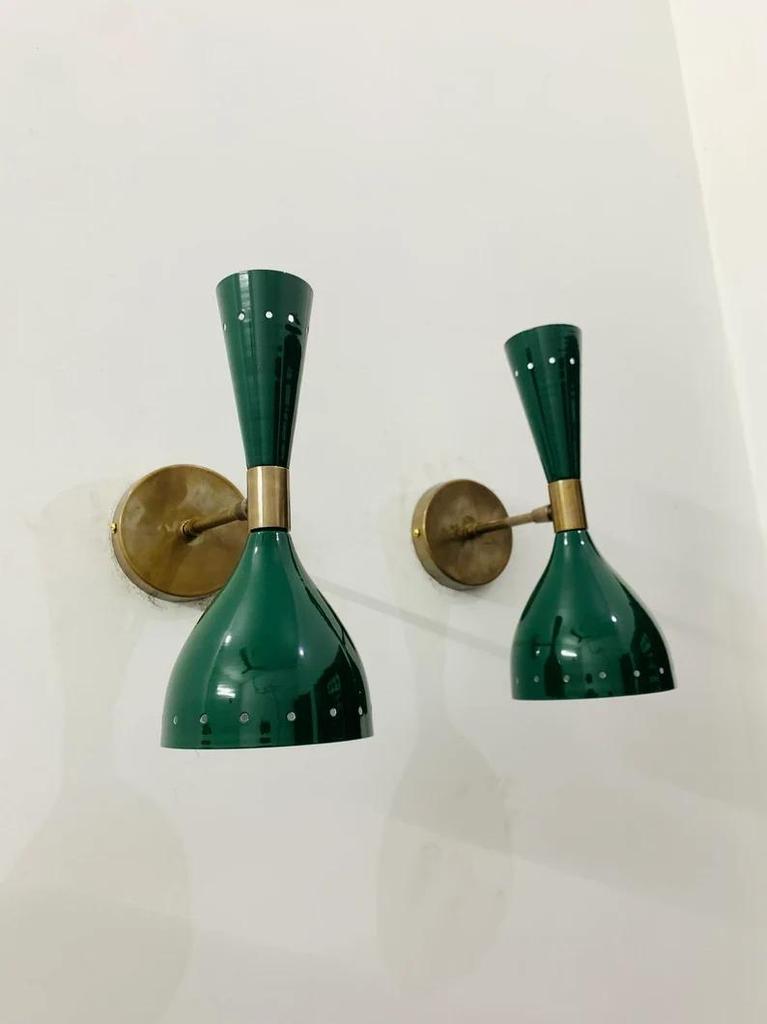 Mid Century Modern Brass Wall Sconce: Green Diabolo Lamp, Pair